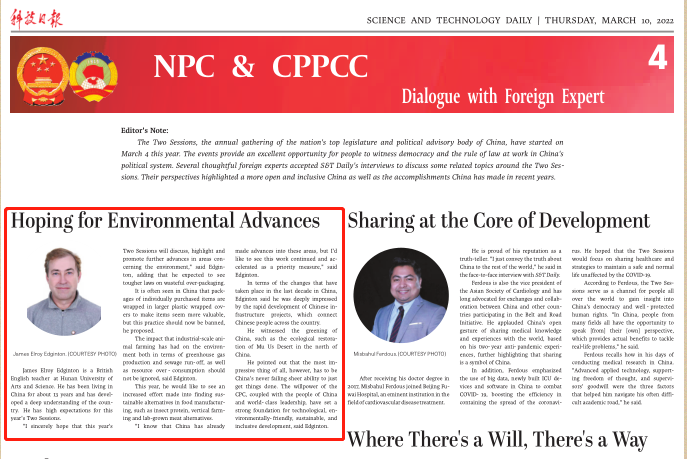 本网讯(通讯员 杨妙)3月10日,《科技日报》(英文版)“外专面对面-两会特辑”专栏刊登了对我校英籍外教詹姆斯·艾瑞·艾金顿的采访文章《希望继续探讨环保议题》(Hoping for Environmental Advances)。此前,詹姆斯接受采访的视频已在《科技日报》官方微博和官方微信视频号中播出。这是《科技日报》(英文版)第二次刊登詹姆斯的相关文章。2021年10月,《科技日报》(英文版)曾发表詹姆斯的署名文章《经历中国的快速发展》。