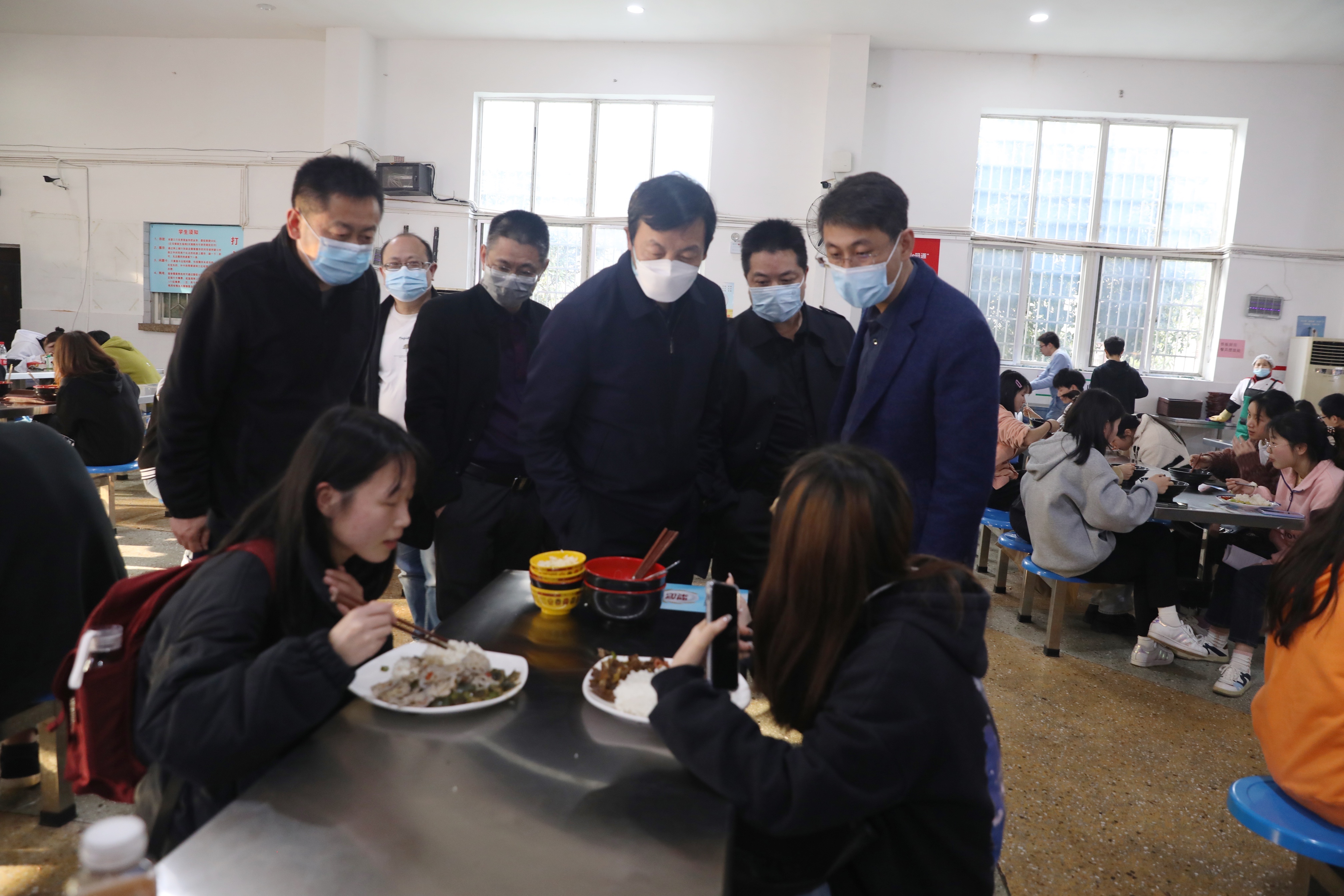 刘宇文一行在调研过程中,详细询问了学生在疫情封校期间的生活与学习情况,并重点对疫情期间校内商铺经营、学生伙食管理等工作进行了督促检查。