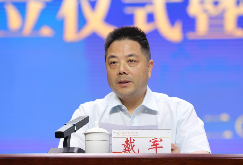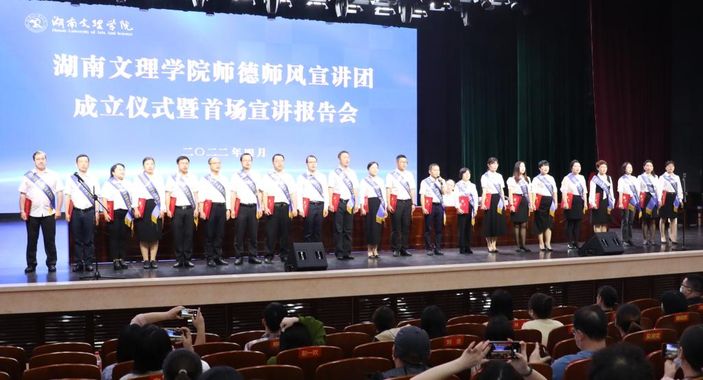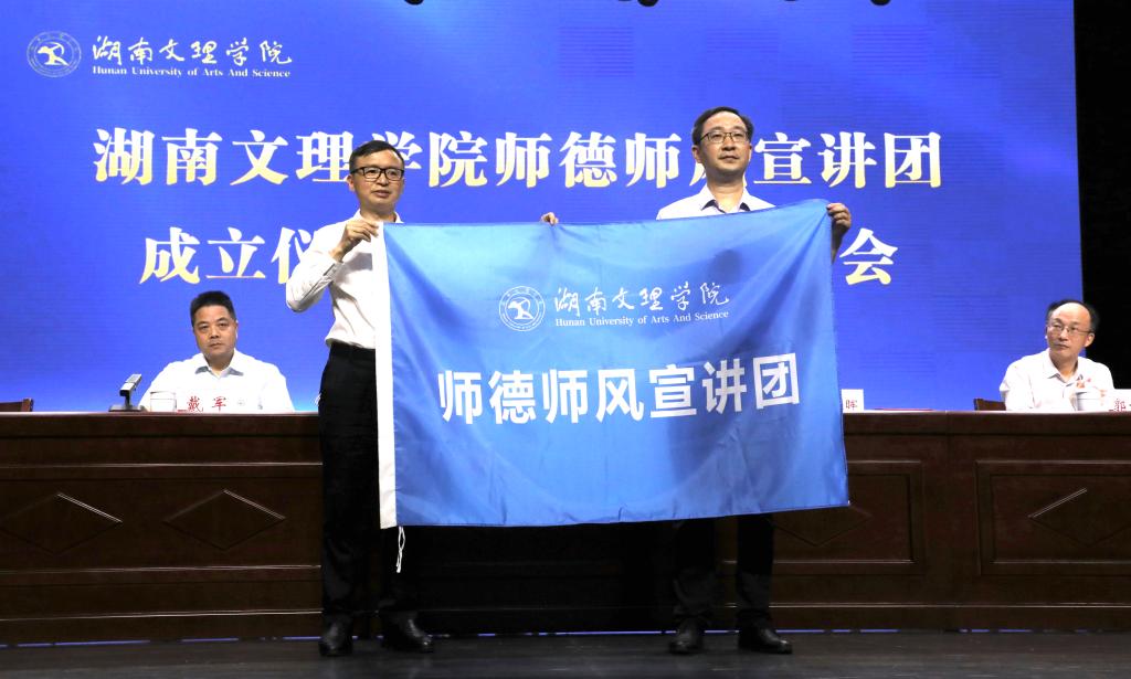 在仪式上,戴军宣读了学校成立师德师风宣讲团的文件精神。学校为巩固“师德师风建设年”成果,充分发挥先进典型示范引领作用,面向教师主动讲好师德故事,以身边事感动身边人、带动身边人,以身边榜样传递师德力量,进一步增强师德师风建设实效,创新师德师风教育形式,创亮师德师风建设品牌,决定成立湖南文理学院师德师风宣讲团。宣讲团团长由学校党委书记担任,执行团长由分管教师工作部的校领导担任,领队由党委教师工作部部长担任,成员由学校优秀教师、师德标兵等先进典型代表组成。