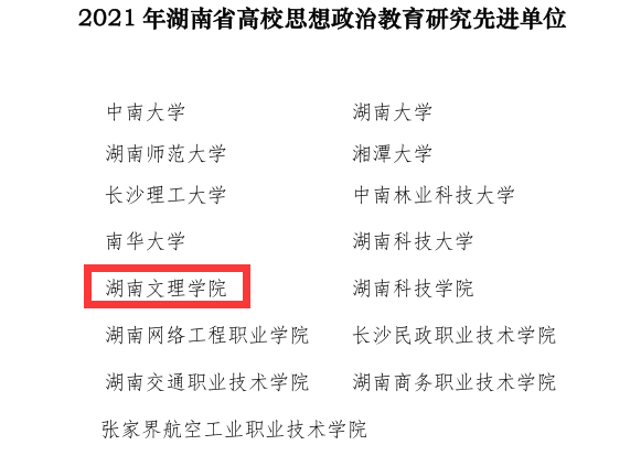 本网讯(记者 易姣)近日,湖南省高校思想政治教育研究会发布《关于表彰2021年湖南省高校思想政治教育研究先进单位、先进个人的通报》《关于表彰2021年湖南省高等学校思想政治教育研究优秀论文、案例、专著的通报》,湖南文理学院获评“2021年湖南省高校思想政治教育研究先进单位”,杨建华老师被评为“2021年湖南省高校思想政治教育研究先进个人”;罗碧琼、唐松林老师撰写的论文《推动社会主义核心价值观落地落实》获“2021年湖南省高校思想政治教育研究优秀论文一等奖”,马晗初老师的思政教育研究案例《探索“12264”党建工作法,融合创新促发展》获“2021年湖南省高校思想政治教育研究优秀案例三等奖”。