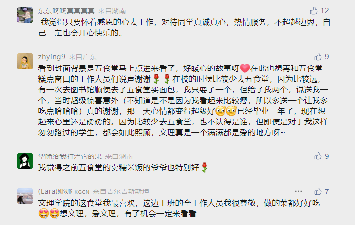 学生和校友们在官微纷纷为五食堂工作人员留言点赞