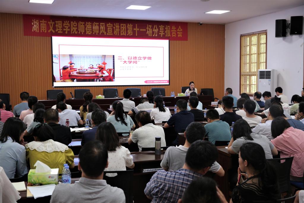 本网讯(记者 易姣 摄影 崔琴 张仪 邓静)6月14日下午,学校师德师风宣讲团举行第二轮集中分享报告会。宣讲团成员分成5个小组分别到数理学院、化材学院、生环学院、体育学院、艺术学院进行宣讲。党委委员、副校长晏昱观摩了数理学院、体育学院分会场的分享报告会并讲话。