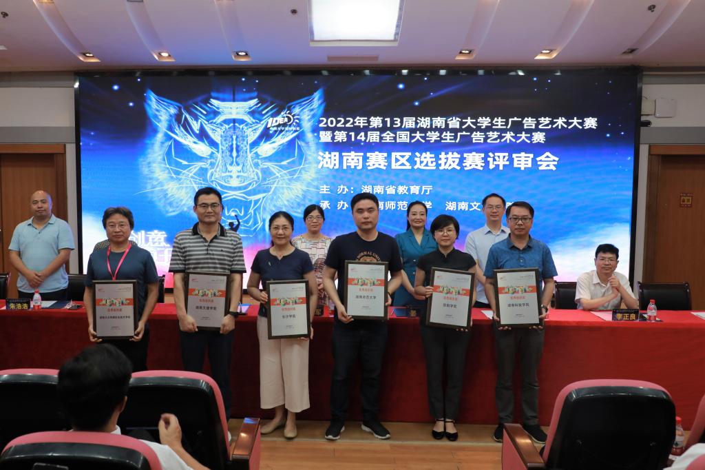 与会领导给参加此次评审工作的评审专家颁发了2022年湖南省大学生广告艺术大赛评委聘书;为湖南师范大学、湖南文理学院、长沙学院、邵阳学院、湖南科技学院、湖南大众传媒职业技术学院等单位颁发了2021年湖南省大学生广告艺术大赛优秀组织奖获奖证书。随后,与会人员集体观看了优秀院校宣传视频。