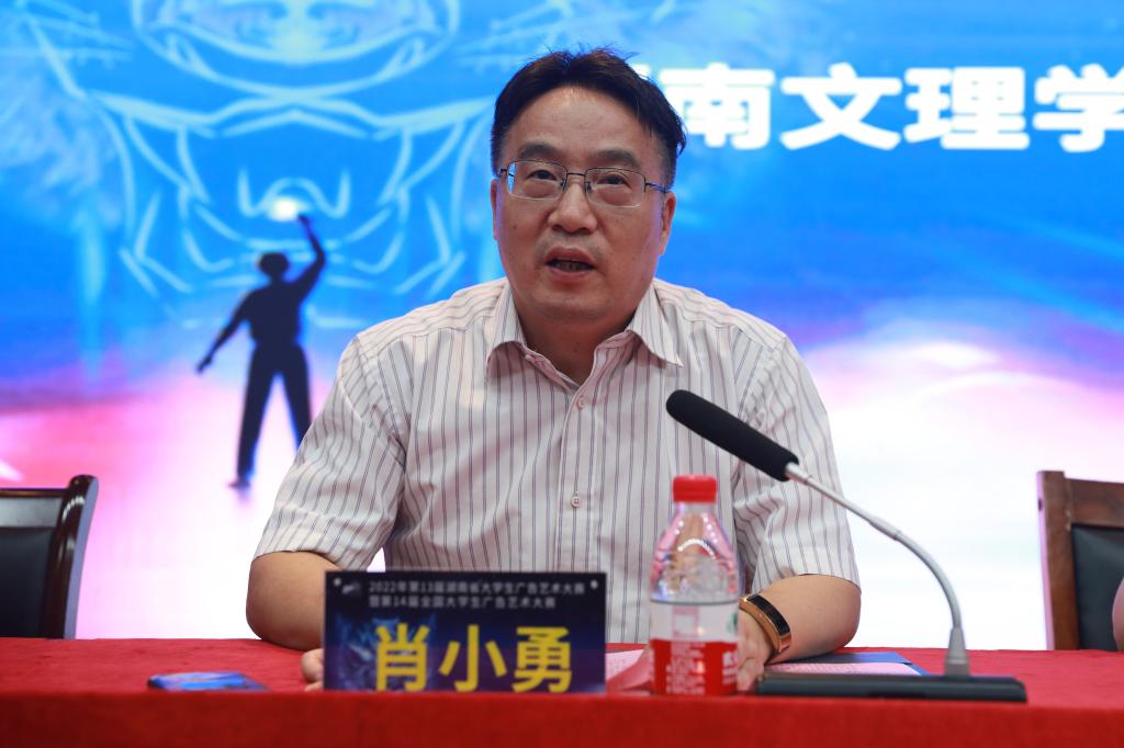 肖小勇致欢迎辞。他代表我校对与会来宾表示欢迎,并从学校发展历程、专业建设、师资队伍、教育教学、人才培养等方面介绍了学校的基本情况,并重点介绍了我校近年来学科竞赛组织情况及所取得的成绩。他表示,大学生广告艺术大赛是我校学生参与面广、影响力大的学科竞赛之一,近三年,我校学生在大学生广告艺术大赛中获国家二等奖3项、三等奖8项,省级一等奖16项,两次获评省优秀组织奖。他指出,本届大学生广告艺术大赛湖南赛区选拔赛评审会在我校举行,既是省教育厅、省大学生广告艺术大赛组委会及省内各个高校对我校的认可,更是对我校学子创新领域的一次检阅,希望各位专家、领导多提宝贵意见,促进我校将工作做得更好。