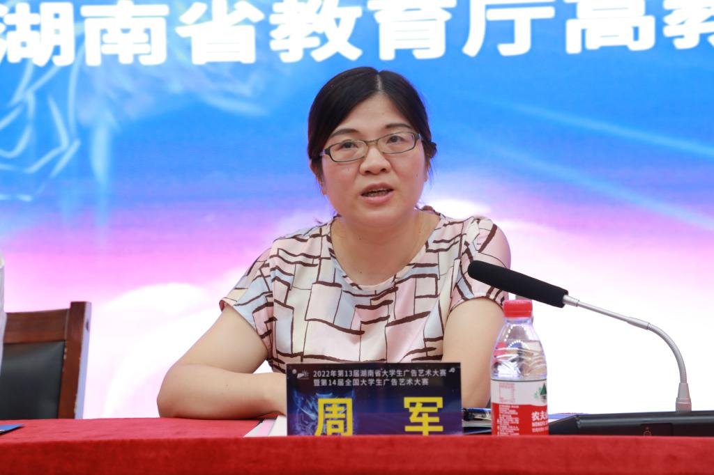 会上,周军就2022年第十三届湖南省大学生广告艺术大赛暨第十四届全国大学生广告艺术大赛湖南赛区选拔赛评审工作作了讲话。她对此次评审会议的组织工作给予了高度肯定,并重点讲了“感谢”“公平”“希望”三个关键词。一是感谢大赛组委会和承办学校的协同努力,让此次评审会议得以顺利举办。二是本次赛事受到的关注度高,评审专家要本着公平、公正的原则,严格按照评审要求、遵守评审纪律开展评审工作。三是希望各位评审专家在评审过程中对此次大赛多提宝贵意见和建议,让今后大赛的举办再上新台阶。