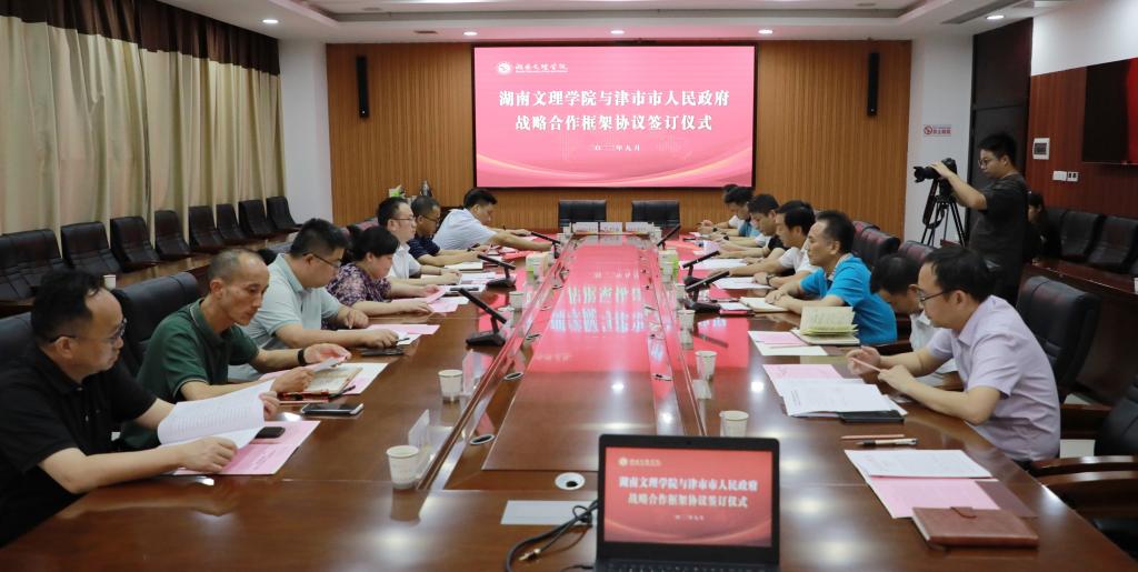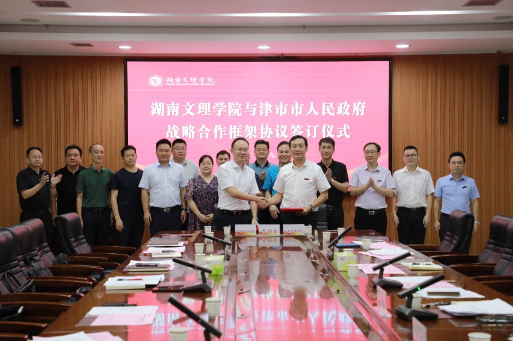 本网讯(记者 易姣 摄影 崔琴)9月7日下午,津市市委副书记、市长彭子晟一行来我校考察交流、洽谈合作,并在我校逸夫楼A305会议室举行了湖南文理学院与津市市人民政府战略合作框架协议签订仪式。我校党委副书记、校长刘宇文与彭子晟代表校地双方签订战略合作协议。津市市委常委、副市长高力,市人民政府党组成员易榕,我校党委委员、副校长李红革等出席仪式。李红革主持会议。
