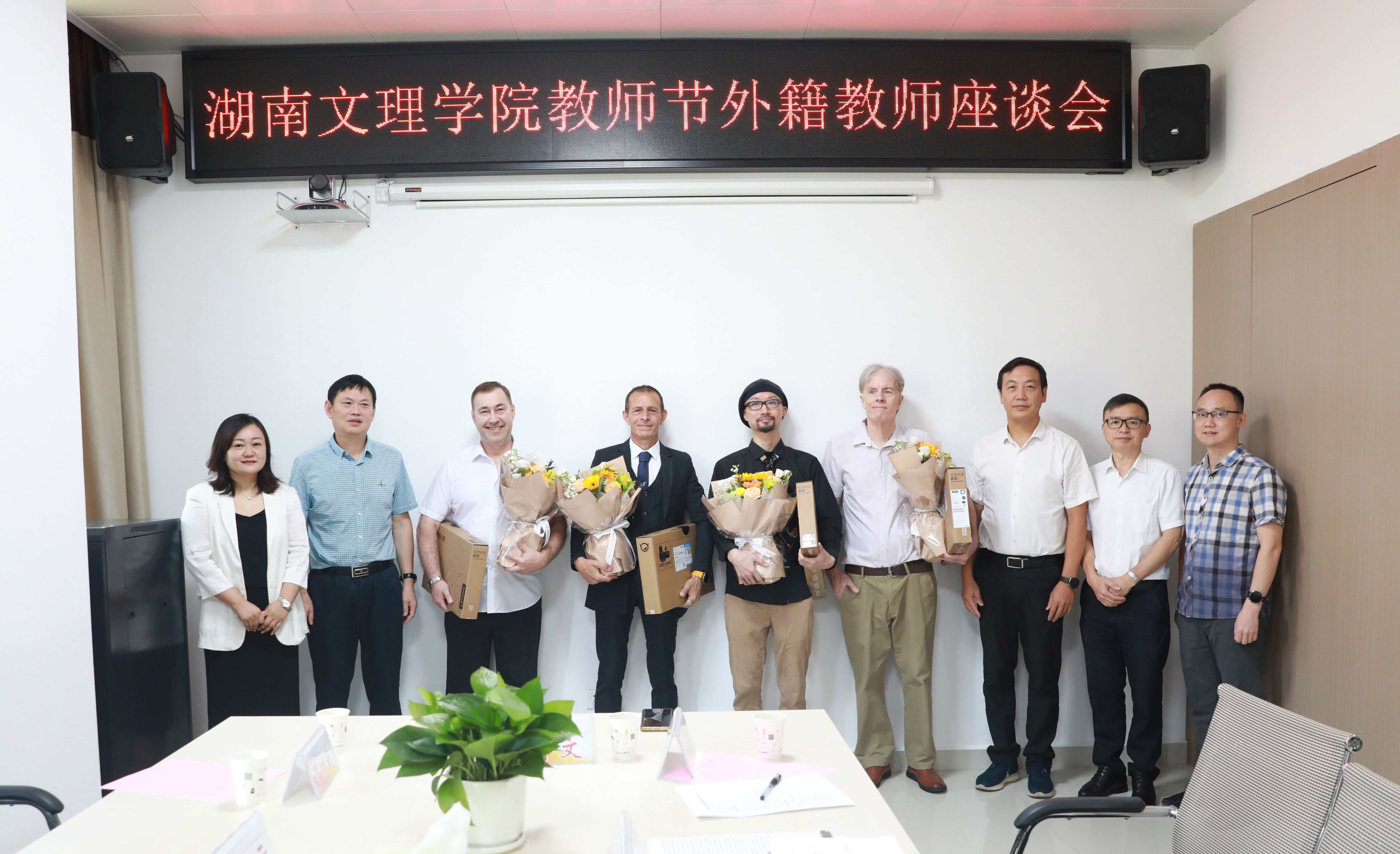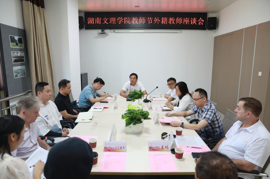 本网讯(通讯员 杨妙)共同庆祝第38个教师节!9月7日上午,我校在逸夫楼外国高端人才引进工作室举行外籍教师慰问座谈会。学校党委副书记、校长刘宇文,党委委员、副校长刘春晖,常德市科学技术局副局长罗功大出席会议,全体在校外籍教师,常德市科学技术局相关人员,学校人事处、国际合作与交流中心相关人员参加座谈会。刘春晖主持会议。