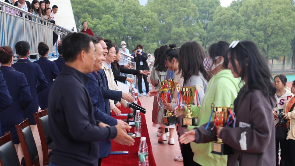 校团委书记胡婷宣布本届体育运动会体育道德风尚奖的获奖单位,他们分别是化材学院、外国语学院、音乐舞蹈学院、医学院、计电学院、数理学院、芙蓉学院、土建学院、国际学院。在激昂的运动进行曲中,主席台领导为获奖单位依次颁奖,现场师生掌声雷动、欢呼声不断。