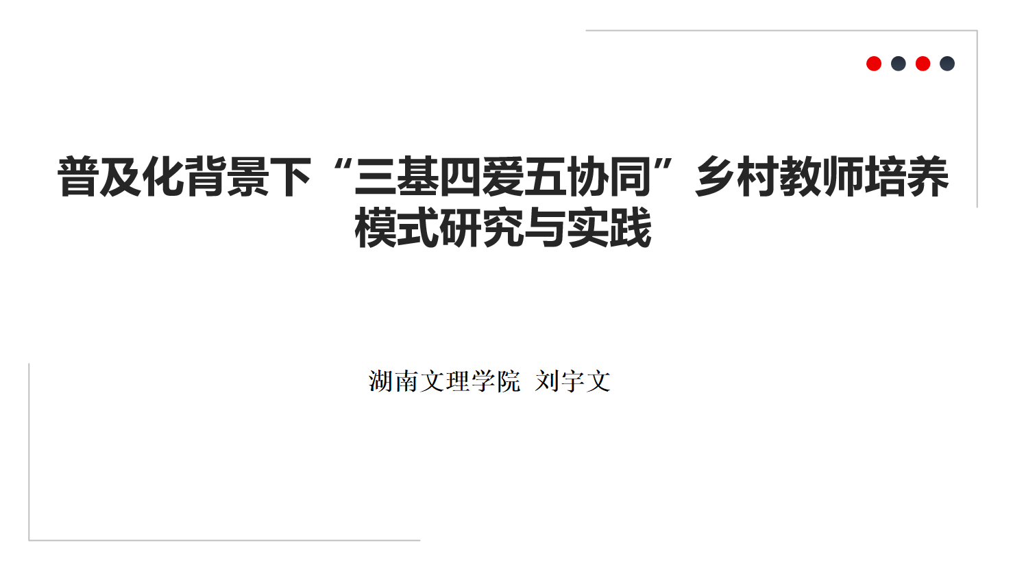 刘宇文以“普及化背景下‘三基四爱五协同’乡村教师培养模式研究与实践”为题作主题报告,介绍了我校乡村教师“三基四爱五协同”培养模式的提出背景,乡村教师培养“三基”新目标,乡村教师培养“四爱”新理念,乡村教师培养“五协同”新路径及培养模式取得的成效与社会反响。