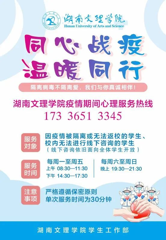 面对疫情带来的教学形式及生活方式的改变,学生很容易出现焦虑、恐惧、易怒等不良情绪,心理中心第一时间发布了《湖南文理学院防疫心理指导手册》,引导学生科学认识疫情,主动调试各种负面情绪。湖南文理自律会公众号先后发布了《面对疫情,不必恐慌》《守护心灵的“绿码”——疫情期间的心理调适》《齐心抗疫情,你我共平安》等多篇心理调适指南推文,通过图文、视频等方式引导同学们调适心理,乐观面对生活。此外,学校心理中心在最短的时间内开通了线上心理咨询热线电话,为学生提供了更为便捷的心理咨询服务,预防可能发生的心理危机状况。