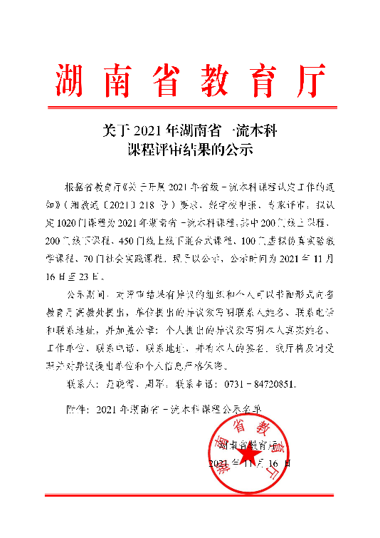 基于OBE理念修改了4个专业人才培养方案,方案体现了产出导向和德智体美劳全面发展理念并侧重实践环节,构建了三维一体的实践育人体系,强化了课堂教学理念、方式和方法的创新。2019年材料科学与工程专业获批“湖南省一流本科专业建设点”,2021年化学专业获批“湖南省一流本科专业建设点”,2023年化学专业通过师范类专业第二级认证的专家进校考查;2020年无机化学获批湖南省线上一流课程,有机化学获批湖南省线下一流课程;2021年无机化学、仪器分析和表面催化计算化学分别获批湖南省线上线下混合式一流课程、湖南省线下一流课程和湖南省虚拟仿真一流课程。