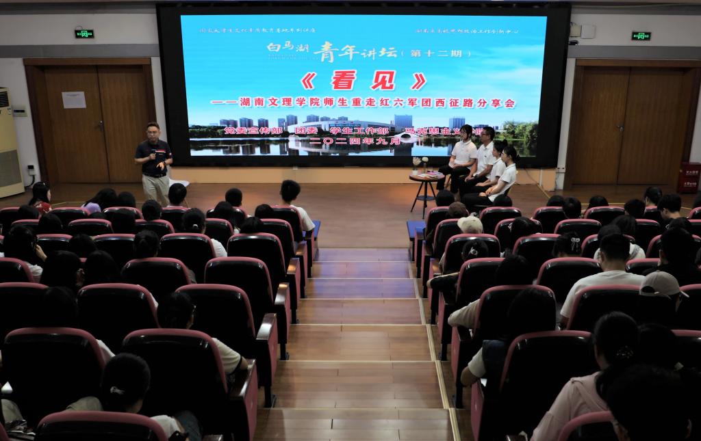 分享会由宣传统战部、团委、学生工作部、马克思主义学院联合主办,宣传统战部常务副部长刘灿主持分享会。马克思主义学院黄向阳教授与学生团队成员韩赫、李宗灿、夏雨,和现场300余名青年师生分享了此次重走红六军团西征路的精彩故事、心路历程以及深刻感悟。