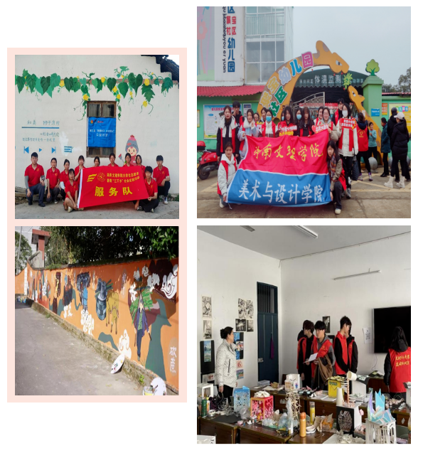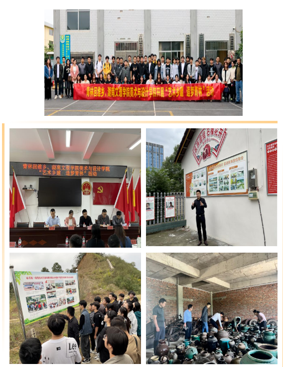 2023年美术与设计学院学生组成“‘艺点亮’之田园微光”美育暑期“三下乡”服务团,到湖南省常德市柳叶湖旅游度假区白鹤镇肖伍铺社区和湖南省怀化市麻阳县步云坪村开展暑期“三下乡”社会实践活动,共有30余名师生参与其中,主要开展了义务支教、新农村墙绘创作、党的理论宣讲等实践活动,学生在肖伍铺村绘制了高1.9米,长21米,主题为《肖伍铺历史画卷》的墙绘。活动获得人民网、中青网、红网常德站等30余家国家、省市级媒体报导,取得了极大的社会影响力。