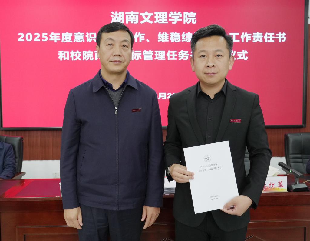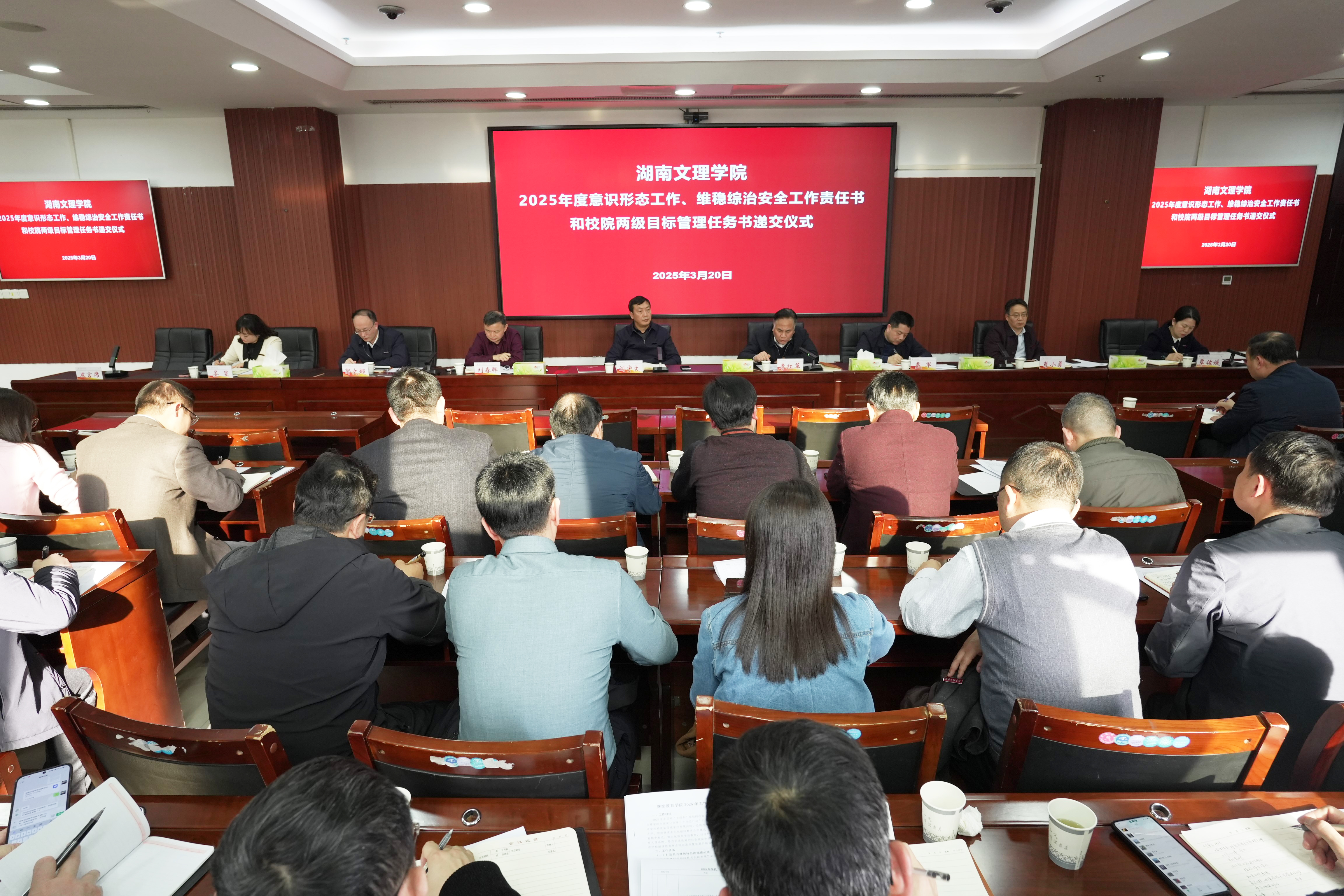本网讯(文字 易姣 丁知平 图片 廖心玲)3月20日下午,学校高质量发展工作推进会暨2025年度意识形态工作、维稳综治安全工作责任书和校院两级目标管理任务书递交仪式在逸夫楼B603会议室举行。党委副书记、校长刘宇文出席会议并讲话,党委副书记李红革主持会议。学校党政班子成员及校属各单位主要负责人参加会议。