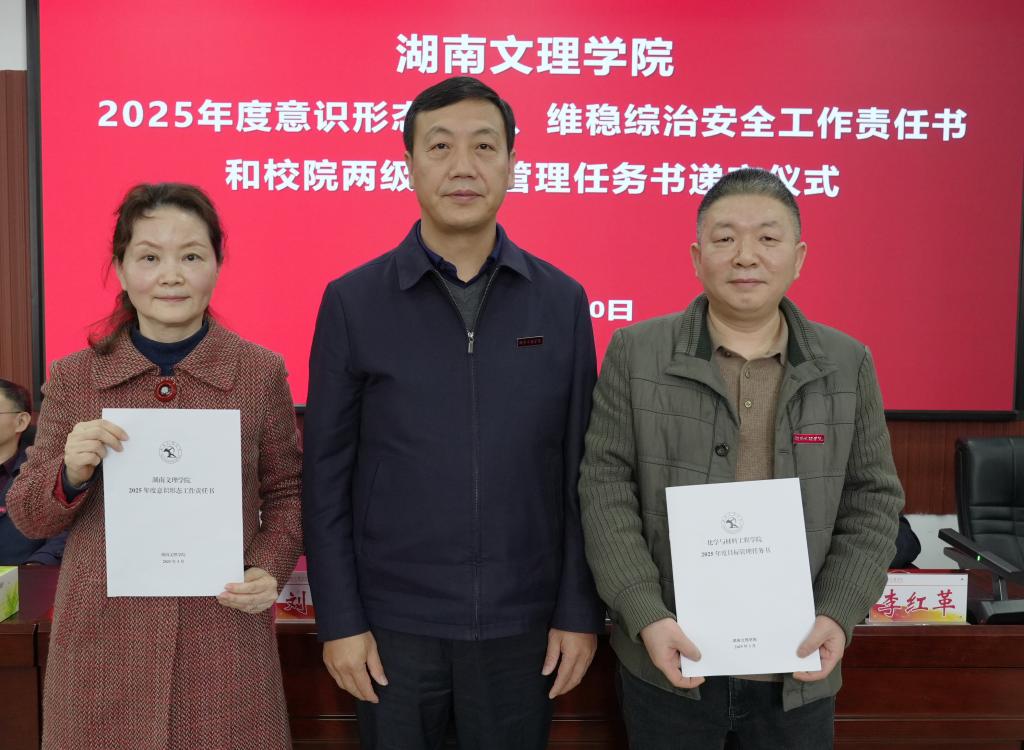 递交仪式上,校属各单位主要负责人依次向刘宇文递交《意识形态工作责任书》《维稳综治安全工作责任书》和《校院两级目标管理任务书》。