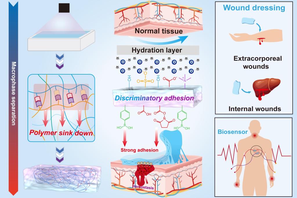 术后粘连和伤口精准管理是临床医学面临的重大难题。传统缝合技术可能导致二次损伤和疤痕形成,而现有的生物粘合剂往往无法区分健康组织与受损组织,容易引发不必要的粘连。针对这一挑战,该研究团队创新性地提出“静电相互作用触发宏观相分离聚合”策略,成功开发了一种双面异性水凝胶QAD敷料。该材料突破性地实现了对单侧强粘附(~150 J/m2)与另一侧弱粘附(<25 J/m2)的精准调控,可有效避免术后组织粘连问题。此外,QAD水凝胶展现出高效的止血(<129 s)、抗菌(>99%)以及导电特性,为智能伤口敷料和生物传感器的开发提供了全新思路。