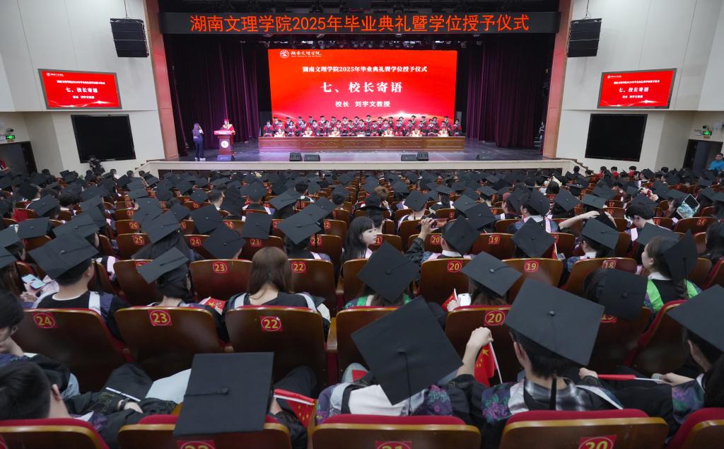 刘宇文对毕业生发出了三点期许。第一,破土而出,在文理沃土中淬炼创新基因。习近平总书记强调,创新是民族进步之魂。创新的密码藏于社会需求的深处,创造的伟力源自脚踏实地的问理求真。希望学子们扎根创新实践,将理想蓝图一步步化为坚实足迹。第二,肆意生长,以湖湘大地为起点燃起创造星火。大家即将奔赴三湘四水乃至于更遥远的目的地,希望湖湘血脉中“心系天下,敢为人先”的精神传统,在大家身上迸发出新的光芒。相信同学们在湖湘大地上燃起的每一寸创造的火苗,最终都将迸发出无尽耀眼的光芒。第三,枝繁叶茂,在时代浪潮中奋楫创造未来。要做“破立并举”的开拓者,以“破局者”的锐气勇敢开辟新赛道。要做“跨界融合”的探索者,以“兼容者”的智慧积极构建新生态。要做“扎根大地”的实干者,以“践行者”的担当奋进照亮新征程。