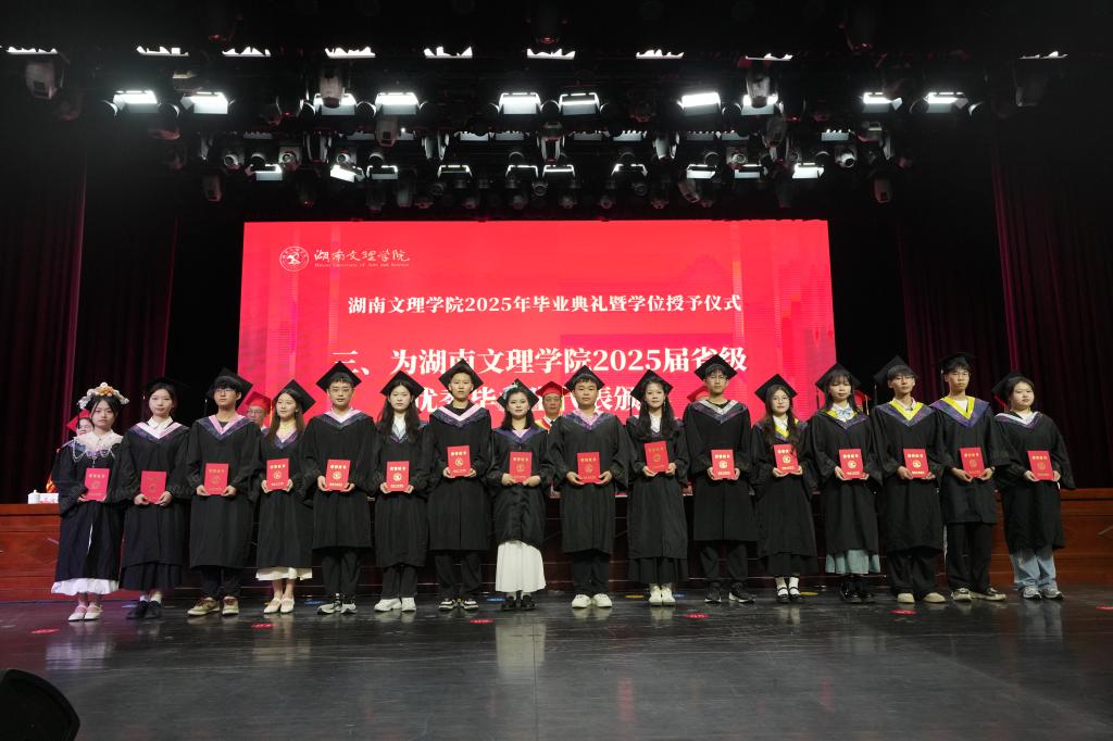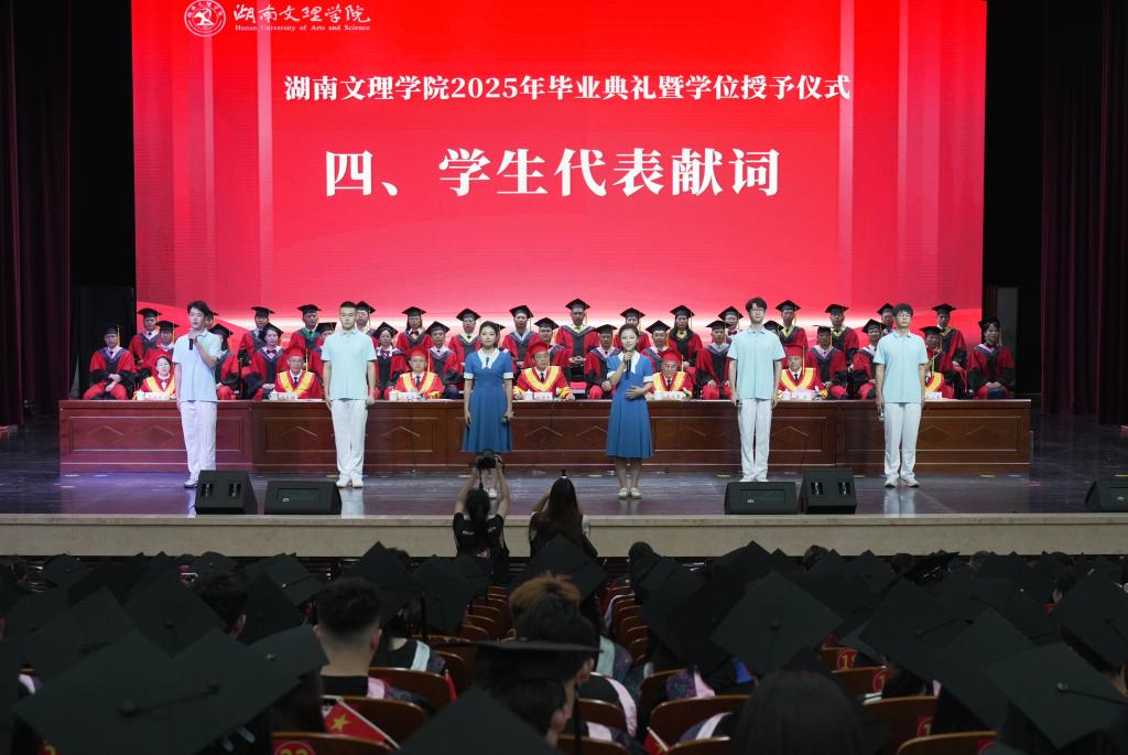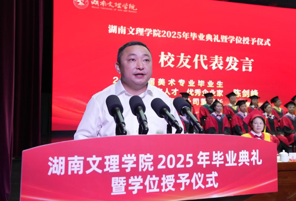 典礼上,刘春晖宣读《关于表彰湖南省2025届优秀毕业生的决定》《关于表彰湖南文理学院2025届优秀毕业生的决定》,校领导为省级优秀毕业生颁奖。6名学生代表以《青春不散,梦想起航》为题向毕业生献词,送上美好的祝福。化学与材料工程学院学生高嘉馨作为毕业生代表在典礼上发言,她表示在过去的六年时光里,校园生活和军营生活赋予了她超越年龄的坚韧和信念。洪城控股集团有限公司董事长、2008届美术专业陈剑峰作为优秀校友代表发言,他结合自身学习经历、工作经验对全体毕业生献上了最真挚的祝福,他希望毕业生们持续提升“可迁移的核心能力、深入学习力、跨界思维力、共情沟通力”,练就飞翔的翅膀,开创美好的人生。