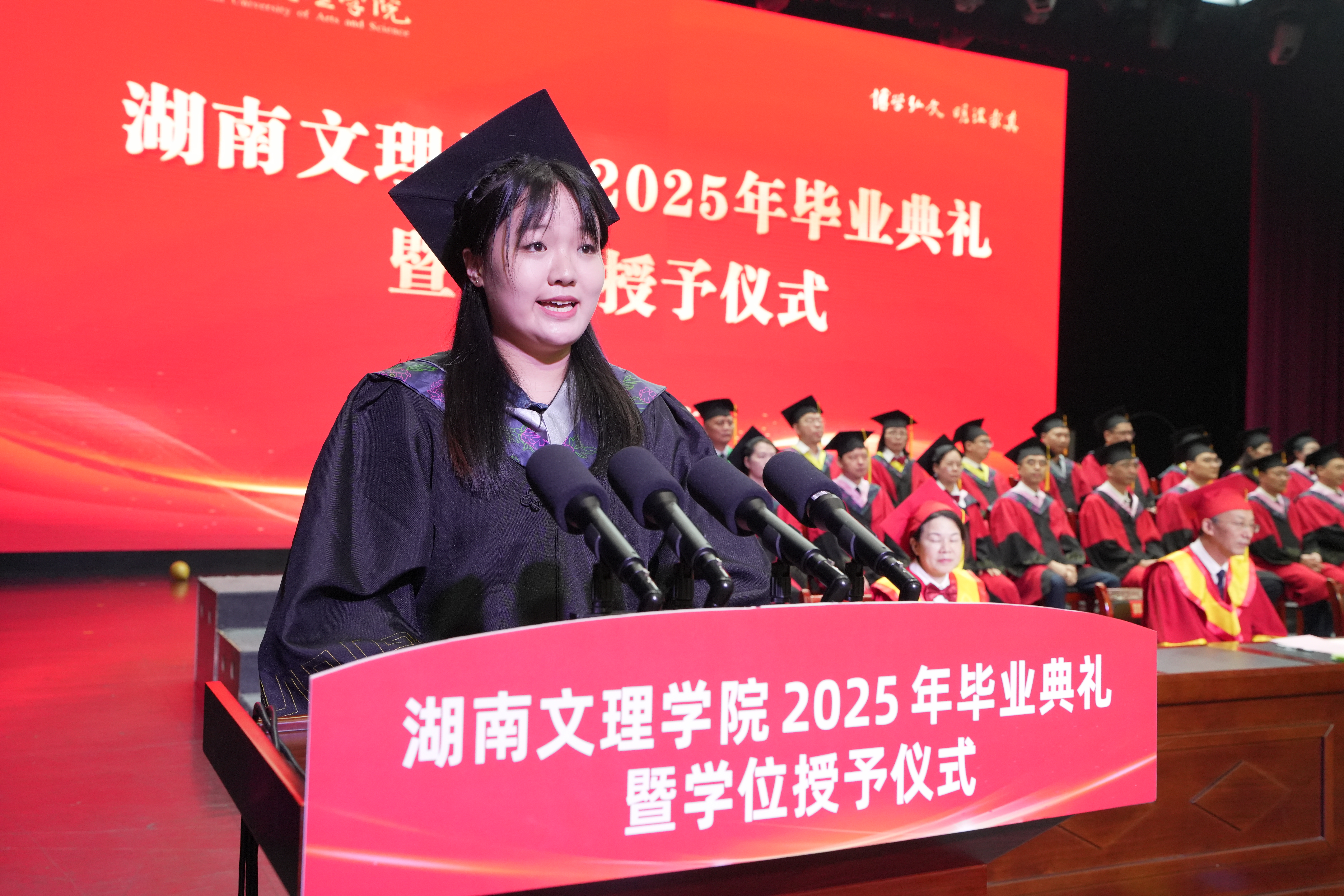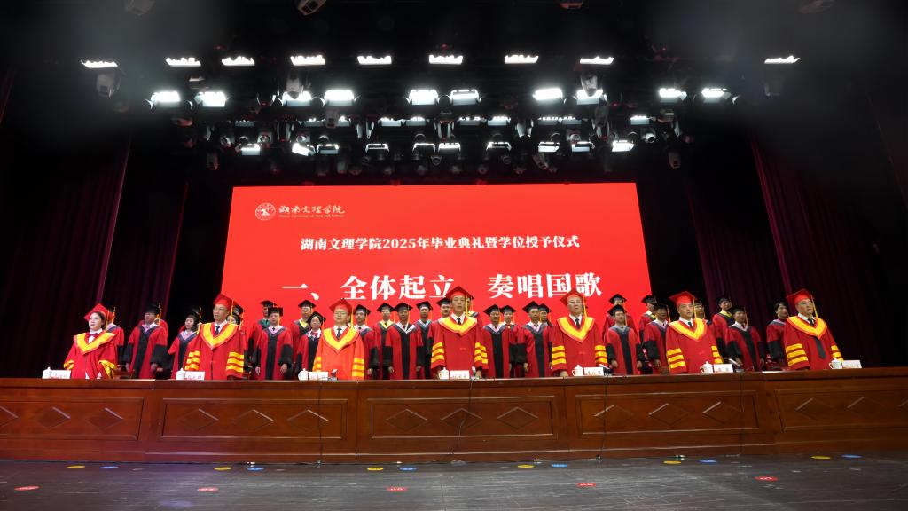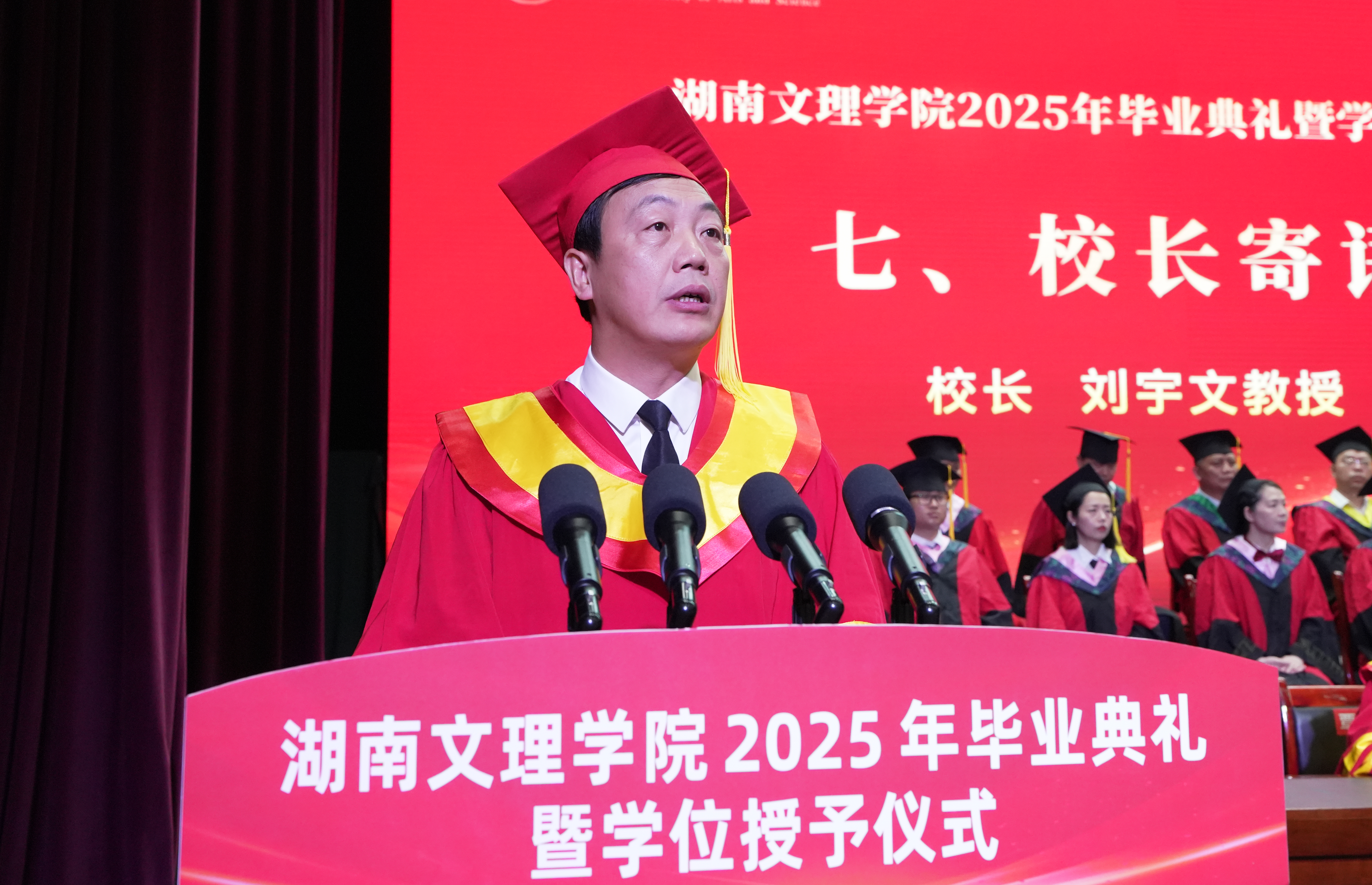 本网讯(文字 余倩 戴安妮 图片 黄超慧 贺鑫羽)四载春秋洗铅华,化蝶展翅愈铿锵!6月12日上午,湖南文理学院2025年毕业典礼暨学位授予仪式在艺术中心举行。学校党委副书记、校长刘宇文在典礼上发表题为《创造吧,年轻的朋友们》的精彩致辞,向5706名毕业生送上了最美好的祝福。党委副书记李红革,党委委员、副校长刘春晖、戴军,党委委员、纪委书记郭文超,副校长肖小勇,党委委员、党政办主任覃佐媛出席典礼,全体授证导师在主席台就坐。典礼由李红革主持。