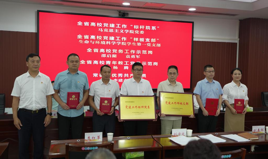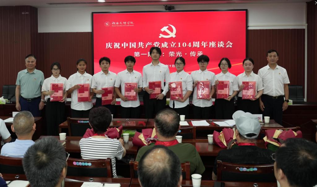 座谈会分两个阶段进行,第一阶段主题是“荣光·传承”,全体与会人员齐唱国歌拉开会议序幕。党委委员、副校长刘春晖宣读省、市有关优秀党组织、优秀党员表彰文件,以及2025年“光荣在党50年”党员名单。党委副书记、校长刘宇文为全省高校党建工作“标杆院系”马克思主义学院党委,全省高校党建工作“样板支部”生命与环境科学学院学生第一党支部,全省高校党务工作示范岗袁勇军、邵启湖,全省高校青年教工党员示范岗杨腾,常德市优秀共产党员李建奇颁发奖牌、证书,为“光荣在党50年”党员代表彭友林、周德政、侯必新、向多林颁发纪念章,青年学生党员向老党员献上鲜花。