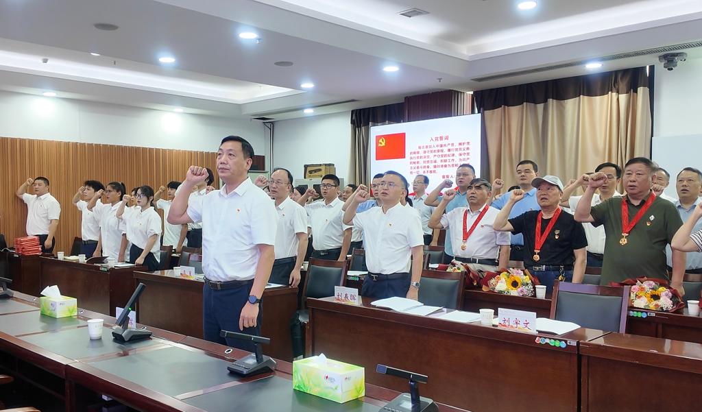 之后,在刘宇文的领誓下,全体预备党员、其他党员举起右手,重温入党誓词。刘宇文、李红革向新党员代表赠送“红色成长包”(党章、党徽、学习笔记本)。全体党员共同观看了党员教育短片《夕阳正红》,该片讲述了学校98岁的离休老党员廖忠致及其夫人,数十年来在党爱党、在党言党、在党为党,为学校教育事业发展奋斗一辈子的故事,令人动容,感人至深。