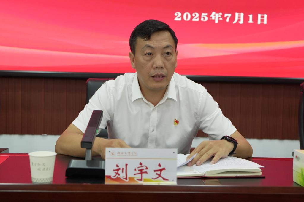 刘宇文在会上讲话,他代表学校党委向荣获“光荣在党50年”纪念章的老党员们、庄严宣誓的预备党员、奋战在学校教学科研、管理服务一线的党员同志们致以诚挚的问候。他指出,学校正处在改革发展的关键时期,党员同志们要牢记初心使命,强化责任担当,在各自的岗位上发挥先锋模范作用。他向全校各级党组织和广大党员提出四点希望:一要锤炼过硬作风,锻造坚强领导核心;二要践行根本宗旨,厚植为民服务情怀;三要强化使命担当,激发创新发展动能;四要严守纪律规矩,永葆清正廉洁本色。他最后强调,党的事业任重道远,学校的发展使命光荣。全校党员同志要弘扬伟大建党精神,传承党的优良作风,以永不懈怠的精神状态和一往无前的奋斗姿态,在新时代教育事业的壮阔征程中、在学校高质量发展的创新实践中书写属于我们这一代共产党人的荣光。(一审 易姣 二审 杨静 三审 刘灿)