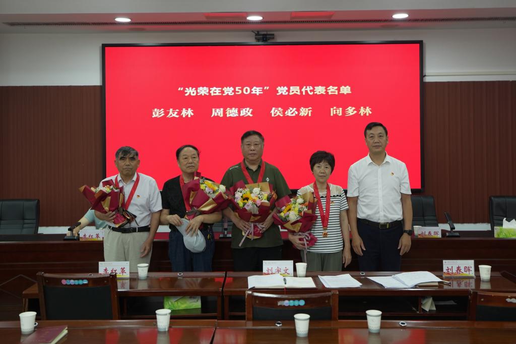 校长刘宇文(右1)为“光荣在党50年”党员代表颁发纪念章