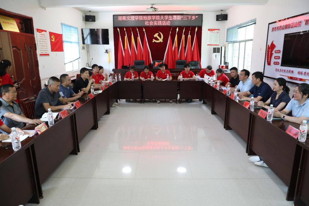 暑期“三下乡”社会实践活动座谈会在白云山村村委会会议室举行。津市市副市长甘雪林,津市市文旅局常务副局长肖何,津市市药山镇镇长庹锋,津市市药山镇白云山村村支书雷秋霞,津市市药山镇白云山村驻村第一书记赵小平,我校团委书记胡婷,地旅学院党委书记郭兴体、院长傅丽华,学校党政办,地旅学院相关负责人以及学院“三下乡”实践团队全体师生参加座谈会。座谈会由郭兴体主持。