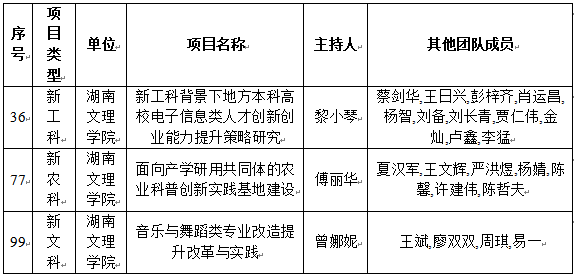 本网讯(教务处 供稿)近日,湖南省教育厅发布《关于2025年湖南省新工科、新医科、新农科、新文科研究与实践项目立项的通知》,我校黎小琴、傅丽华、曾娜妮三位老师申报的项目分别成功获批新工科、新农科、新文科研究与实践项目,充分彰显了学校在高水平应用型人才培养和学科创新领域的实力与担当。