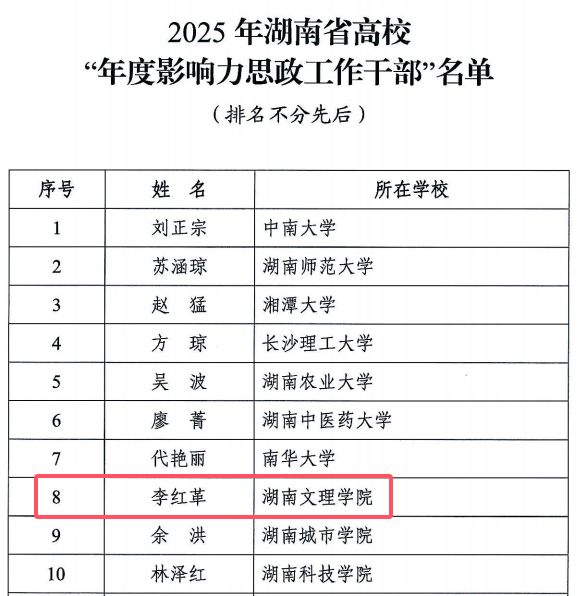 为深入贯彻习近平新时代中国特色社会主义思想,全面落实党的二十大和二十届二中、三中全会精神,学习贯彻全国和全省教育大会精神,先行先试“新时代立德树人工程”,大力培养选树新时代高校思政工作者和大学生先进榜样。湖南省教育厅联合中南出版传媒集团及湖南中南传媒公益基金会组织开展了2025年湖南省学校思政教育奖励基金年度影响力人物推选活动。经各高校推荐、资格审核、专家评审、结果公示,共推选出15名“年度影响力思政课教师”、15名“年度影响力思政工作干部”、20名“年度影响力大学生”。