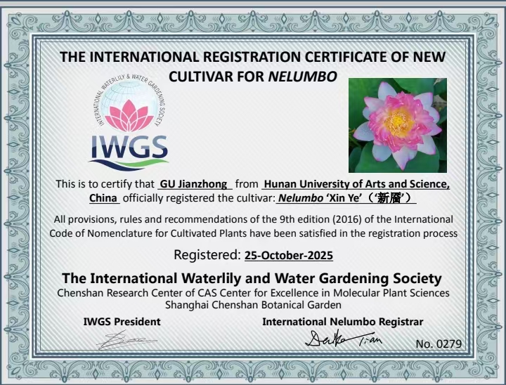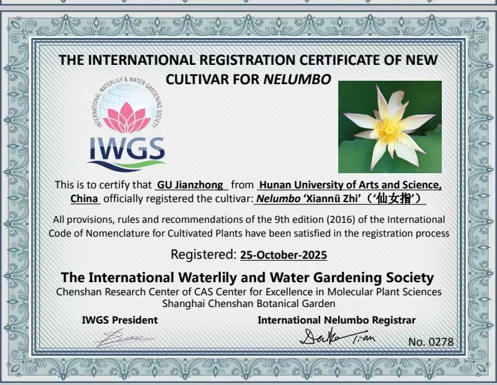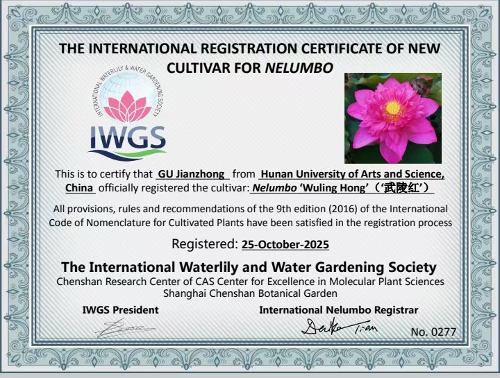 本网讯(文图 罗泽元)10月25日,由我校土木建筑工程学院顾建中教授团队自主培育的3个荷花新品种“武陵红”“仙女指”“新靥”通过了国际睡莲及水景园艺协会(IWGS)的审定,顺利完成品种国际认证。