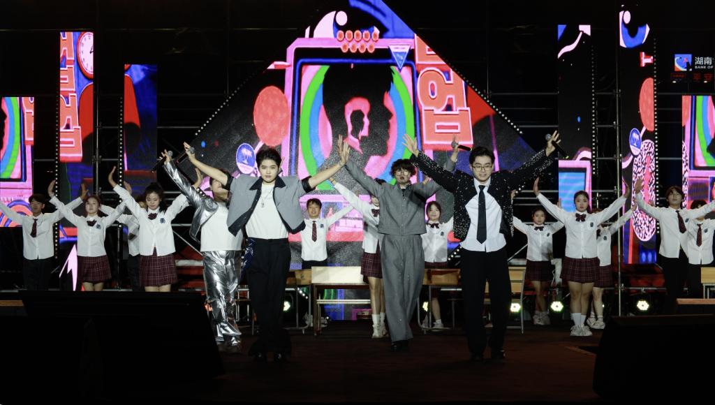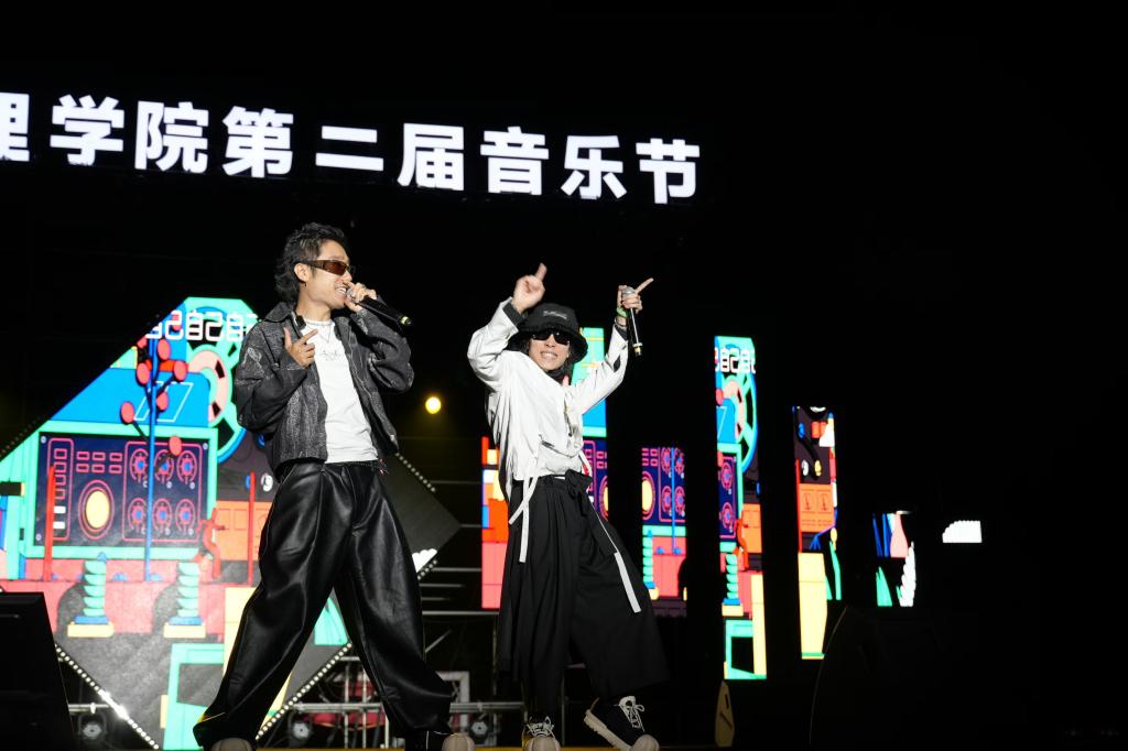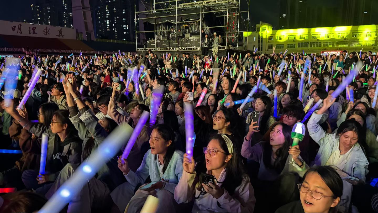 音乐节在印刻着“博学弘文、明理求真”校训和“尚善尚知尚行、爱国爱校爱人”校风的主题激光秀中拉开序幕,酷炫光影瞬间点燃全场热情。吕博等同学表演的《身骑白马》《悟空》《将进酒》古风串烧,创新融合了传统诗词与现代音乐;王伟成老师与学生表演的《天下》,将乐器、武术与舞台表演完美交织。艺人与校友的助阵将音乐节引入佳境,张叶蕾的《蚁》《月光啊月光》等歌曲以细腻声线营造“治愈时刻”;螺丝刀RoseDoggy组合《浦西MAN》用动感节奏点燃全场;彭添梁与充电宝乐队以《曾经的你》《New Boy》唤起青春记忆;谭伟献唱的《龙的传人》将音乐节推向最高潮,万名师生齐唱经典旋律,歌声响彻白马湖畔。