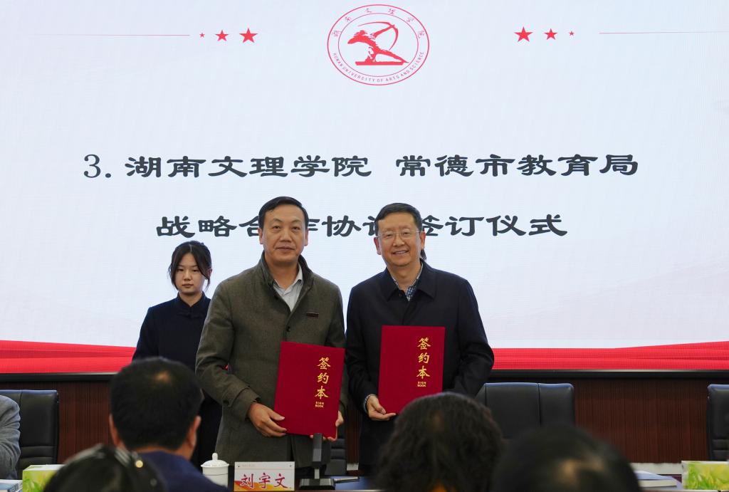 会上,湖南文理学院与常德市教育局签署了战略合作协议,标志着校地合作进入新阶段。在授牌与聘书颁发环节,刘宇文为教育硕士培养指导委员会委员颁发聘书,李红革为联合培养基地授牌,戴军为教育实践基地授牌,并为高飞、谌晓芹、董树军、王翀、沈红宇等首批行业导师代表颁发聘书。常德市教育科学研究院院长傅广生、鼎城区第一中学党委书记蒋金海作为基地负责人与行业导师代表发言。蒋金海回顾了在母校求学的经历,表达了对教育事业的执着与热爱,并承诺将竭尽所能履行导师职责,助力学生成长。