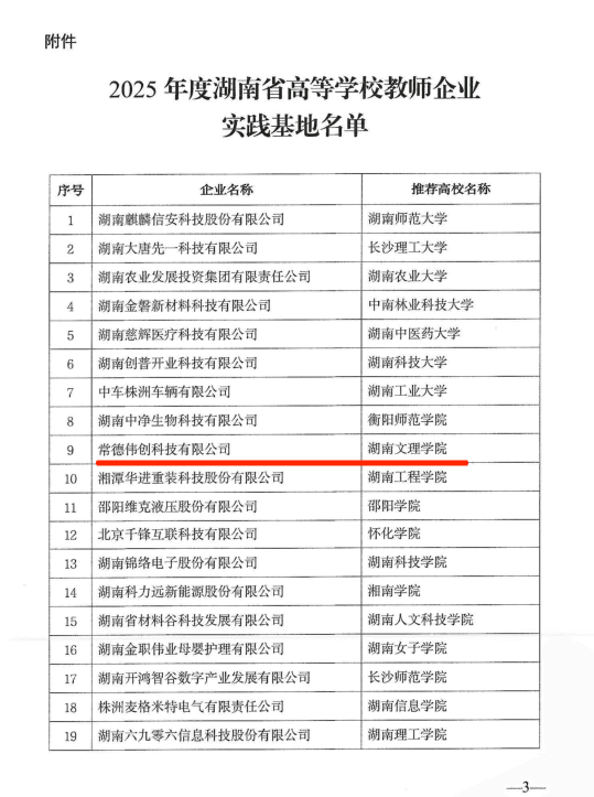 本网讯(机械学院 供稿)近日,湖南省教育厅、湖南省发展和改革委员会、湖南省人民政府国有资产监督管理委员会联合公布了2025年度湖南省高等学校教师企业实践基地名单,我校机械工程学院与常德伟创科技公司联合申报的教师企业实践基地成功入选。