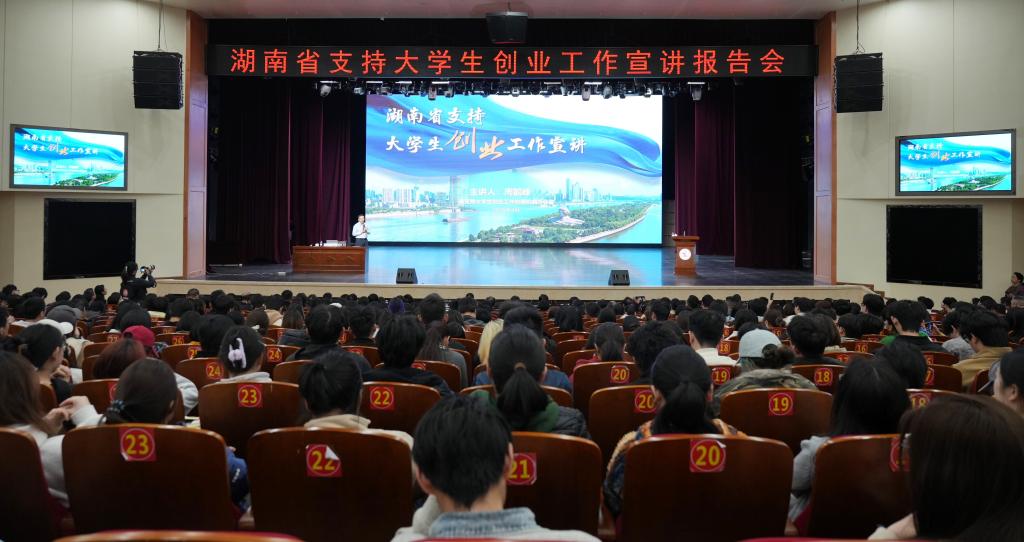 报告会从“中央政策支持”“大学生创业是促进社会发展的强大动力”“湖南支持大学生创业的比较优势明显”三个方面,系统阐释了省委、省政府支持大学生创业的战略考量和坚定决心。同时,从“政策保障系统集成、财政资金引导、创投资本体系、孵化载体提质、服务托举优化、教育赋能完善、宣传氛围营造”等维度,全面介绍了湖南支持大学生创业工作取得的阶段性成效。报告还围绕政策宣传、政务服务优化、基金矩阵完善、孵化载体专业化提升、实战型导师队伍建设、高校创业教育改革、特色课程体系建设、品牌化创业赛事构建、创业在湘品牌打造、统筹协调推进等十个方面,明确了下一步工作方向和重点任务。整场报告含金量高、干货满满、富有激情,让在场师生深受教育与启发。