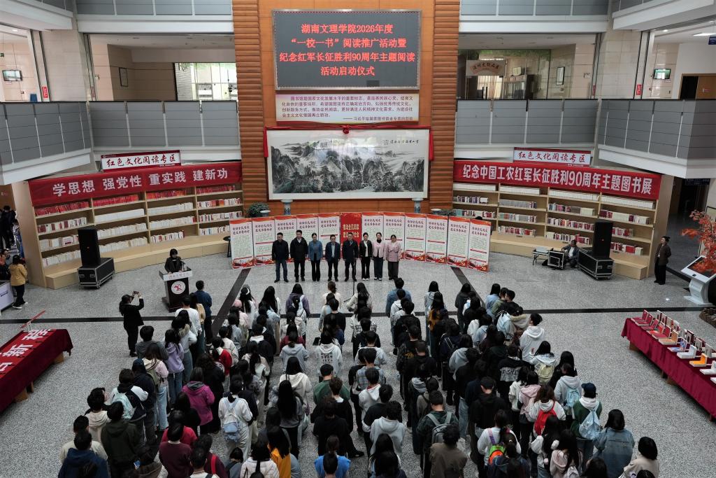 仪式上,肖小勇为启动仪式致开幕词并宣布阅读推广活动启动。他指出,2026年是红军长征胜利90周年,学校将“一校一书”阅读推广与“纪念红军长征胜利90周年”深度融合,以此引导师生通过阅读传承红色基因、赓续红色血脉,在品读长征故事中跨越时空与先辈对话,汲取直面困难、勇毅前行的磅礴力量。他向大家提出了三点希望:一是读红色经典,筑牢信仰之基。希望大家多读党史、长征史方面的优秀读物,把阅读当成一次精神的“长征”,让红色基因在思想的碰撞中入脑入心。二是读文化典籍,涵养浩然之气。希望大家向经典深潜,在书香中提升审美情趣,大力弘扬时代精神,共同涵养湖南文理学院高雅、深厚的校园文化品位。三是坚持学用相长,践行知行合一。要把在书籍中获取的智慧转化为教书育人、刻苦学习的实际行动,不断提升自身的信息素养与综合素养,努力成长为堪当时代重任的栋梁之才。