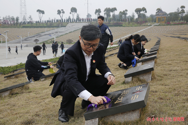 副校长刘春晖(前)和同学们一起祭扫绘描烈士墓