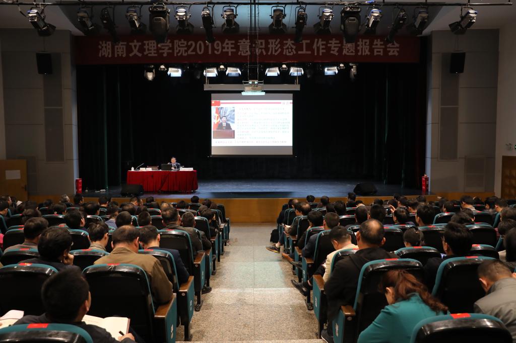 本网讯(记者 易姣 摄影 杨静)4月16日下午,湖南省高校干部培训中心书记、主任,省委教育工委党校常务副校长刘国华教授应邀来我校作了题为“以十九大精神武装头脑,打好意识形态领域的阵地战”的报告。全体在家党委委员,校长助理出席报告会,全校副科级以上干部,马院全体教师,全体学生辅导员及各单位新闻联络员近450人聆听了报告。专题报告由学校党委书记谷正气主持。