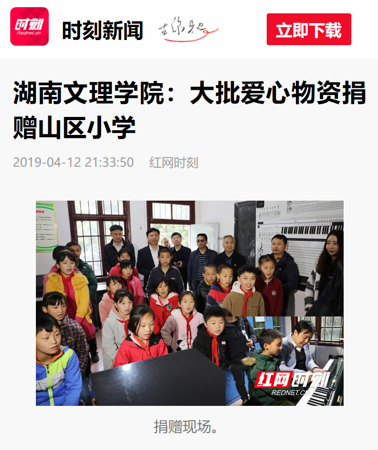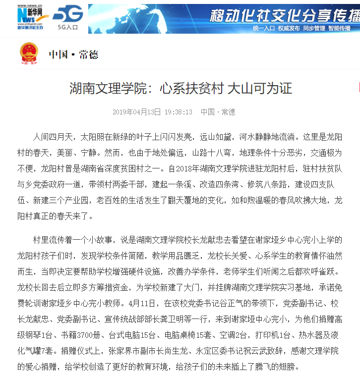 本网讯(记者 袁勇军)4月11日,我校向张家界市永定区谢家垭乡中心完小捐赠一批教学物资,同时向对口帮扶驻点村龙阳村捐赠2019年帮扶资金97.7万元的扶贫事迹,吸引了新华网、湖南日报、湖南卫视、湖南教育电视台、新湖南、红网、三湘都市报、常德日报、常德电视台、张家界电视台等十家主流媒体记者的跟踪报道。