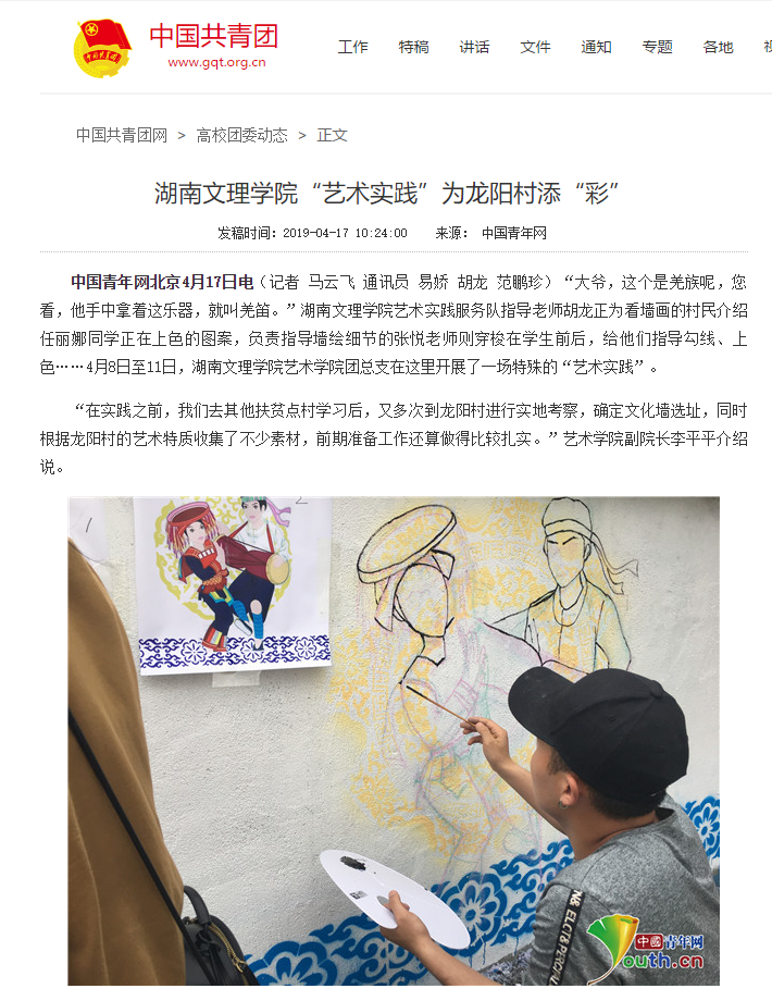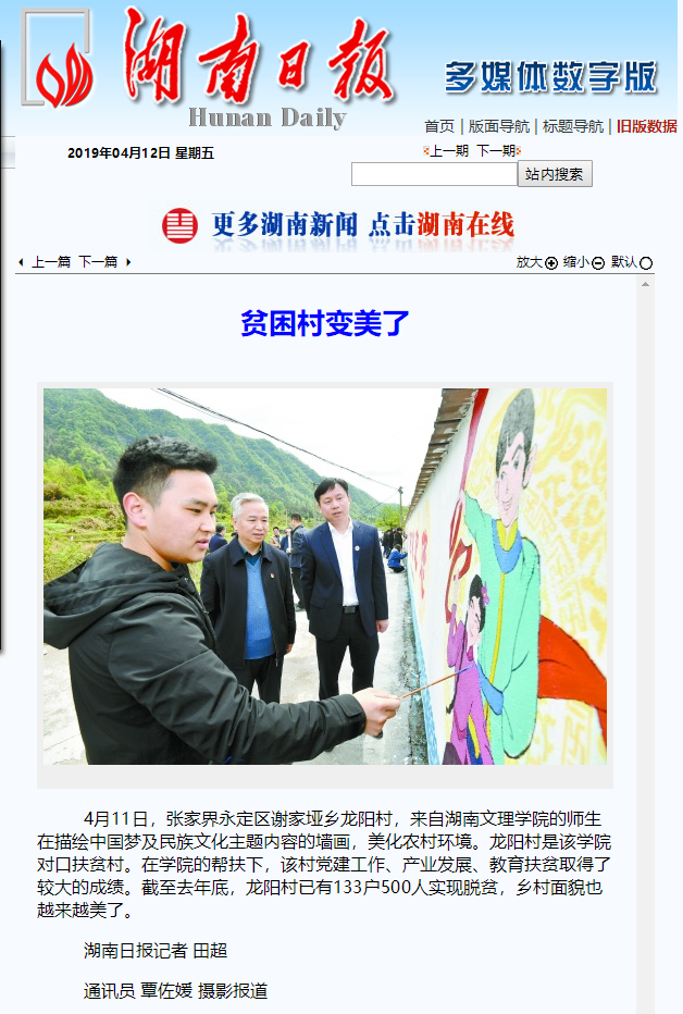 一周时间过去了,十多家主流媒体的新闻报道陆续发布。新华网发表了题为《湖南文理学院:心系扶贫村,大山可为证》的长篇通讯;中国共青团网发表文章《湖南文理学院“艺术实践”为龙阳村添“彩”》;湖南卫视在《新闻联播》中播发了消息《湖南文理学院赴张家界开展教育扶贫》;湖南日报和新湖南则以《贫困村变美了》为题刊发大幅图片新闻;红网发表新闻《湖南文理学院大批爱心物资捐赠山区小学》;湖南教育电视台播发深度报道《高校文化扶贫,贫困村变美了》;湖南教育网则以《湖南文理学院:大批爱心物资捐赠山区小学》为题刊发了新闻;三湘都市报刊登新闻《湖南文理学院:捐赠系列物资,全力帮扶张家界一乡村完小》,点击量已经过万;常德日报刊登了消息《湖南文理学院赴张家界开展教育扶贫》;常德电视台《新闻联播》播发深度新闻《湖南文理学院赴张家界开展教育扶贫》;张家界电视台《新闻联播》则以《湖南文理学院驻村帮扶用真情,精准扶贫见成效》为题,做了3分钟的深度报道。