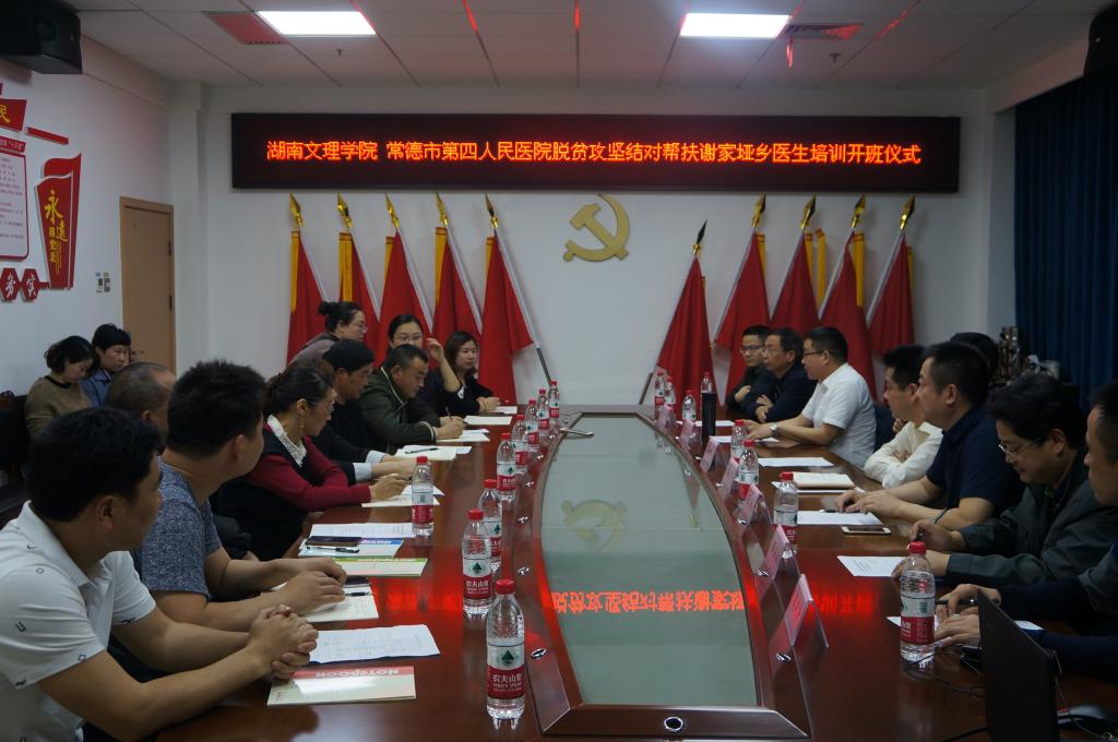 下午三点,在医院427会议室举办了“湖南文理学院与常德市第四人民医院脱贫攻坚结对帮扶谢家垭乡医生培训”开班仪式。我校党委委员、组织部长戴军,常德市第四人民医院院长李南孝,副院长洪智林,我校后勤处处长孔健,驻龙阳村扶贫工作队队长伍宗富出席仪式。仪式由第四人民医院常务副院长陈祥主持。