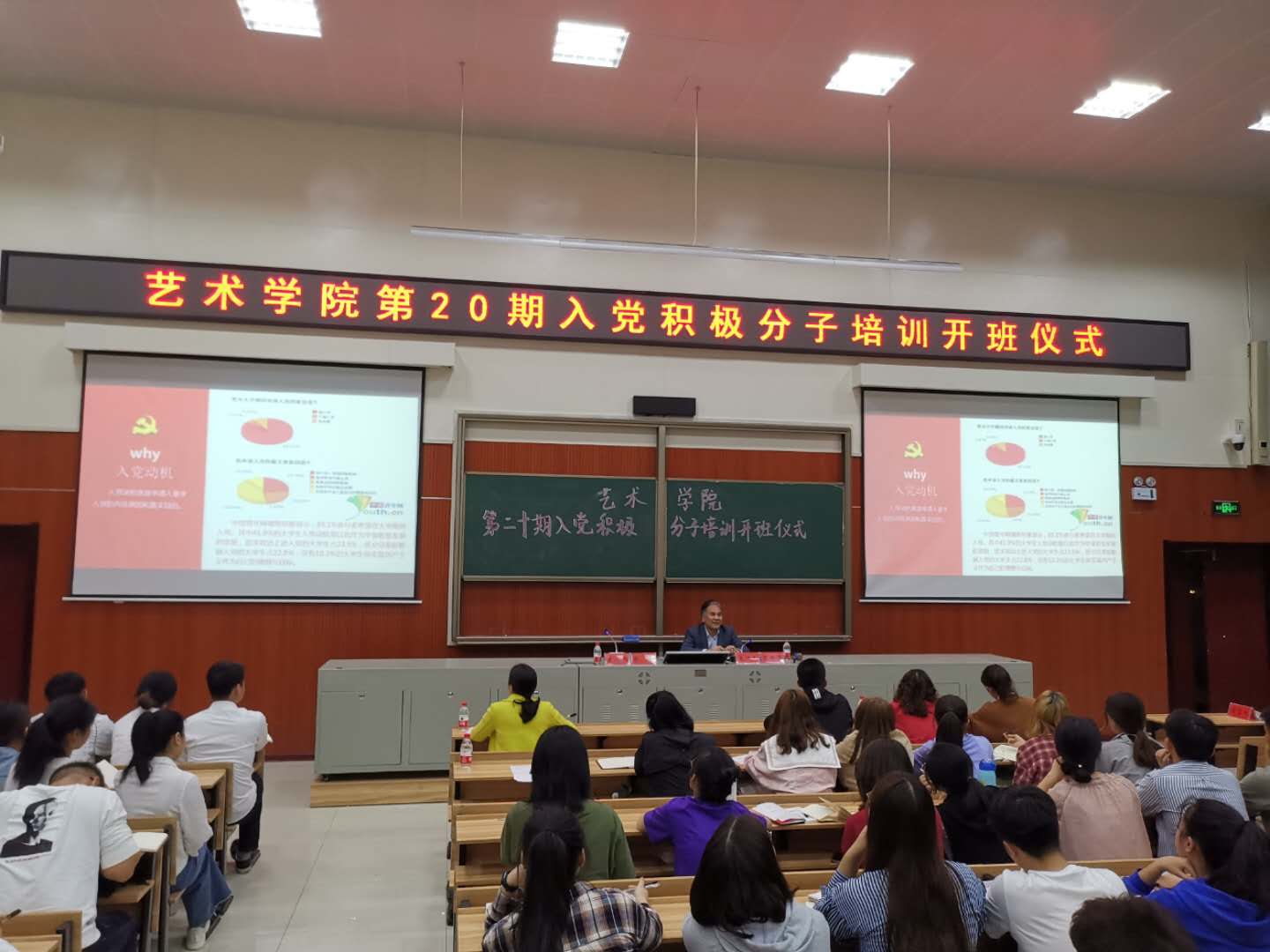 本网讯(通讯员 范鹏珍)4月18日晚7点,艺术学院分党校第二十期入党积极分子培训班开班仪式在逸夫楼西附楼D103举行。开班仪式后,李红革副校长上了题为“端正入党动机,坚定理想信念,做新时代合格党员”的党课。艺术学院党总支副书记(主持党务工作)张霞、学院部分班子成员、学工办全体辅导员以及200多名学员聆听了本次党课。