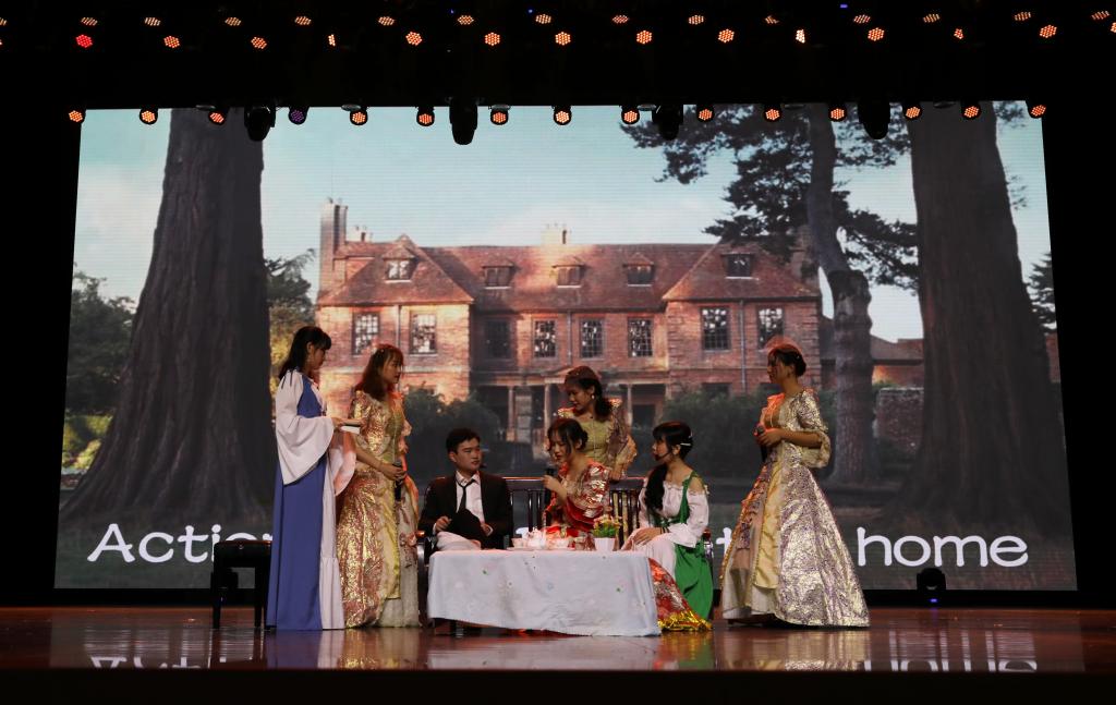 学生改编呈现的7个作品分别是英语舞台剧《美女与野兽》、《巴黎圣母院》、《仲夏夜之梦》、《傲慢与偏见》、《窈窕淑女》、《爱乐之城》和日语舞台剧《进击的巨人》。生动的画面、标准的口音、规范的语音语调,无一不在展示着同学们良好的舞台表现和口语表达能力。其中,英语16102班表演的《巴黎圣母院》将剧本与现实相结合,在原著的基础上加入了近日巴黎圣母院失火一事,引起了现场的强烈共鸣。英语16102班沈同学表示,班里同学希望借此表演致敬经典,同时向同学们传达珍惜当下的深刻涵义。