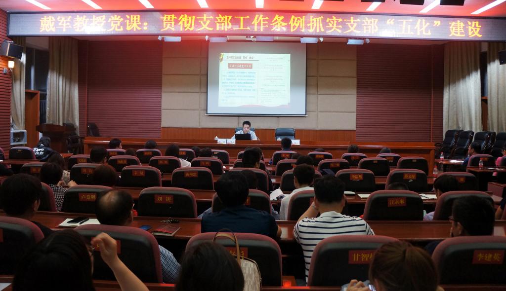 戴军在党课中重点讲述了两大问题:一是“为什么高度重视党支部建设”,二是“怎样抓党支部‘五化’建设”。他结合党的历史和当前形势从“高度重视党支部建设是马克思主义政党的基本要求、是贯彻落实《中国共产党章程》的必然要求、是解决党支部存在问题的现实需要、是提高党员队伍综合素质的迫切要求”4个方面阐释了重视支部建设的重要意义。戴军指出,党支部“五化”建设要做到“支部设置标准化、组织生活正常化、管理服务精细化、工作制度体系化、阵地建设规范化”。戴军就每一部分的具体目标、基本原则、解决的问题进行了详细解读,并就相关的工作方法提出了指导意见。