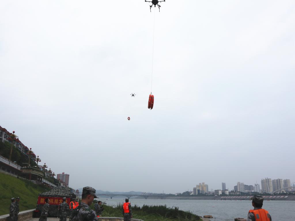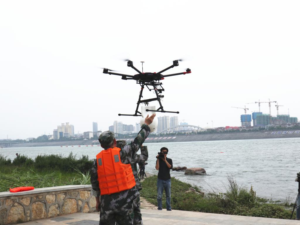 下午3点,澧水江面马达轰鸣,百舟竞发,身穿救生衣的抢险民兵乘舟奔赴抢险地点,河水高涨,河对岸数百民兵正在抢修子堤,忽然有群众在洪水中落水,并迅速向下游漂去,水流湍急,冲锋舟无法靠近。指挥员一声令下,我校计算机与电气工程学院无人机应用研究所的数台无人机,携多个救生圈飞抵落水群众上方,向落水群众抛投救生圈,使被困群众转危为安。