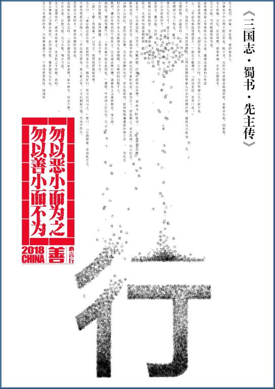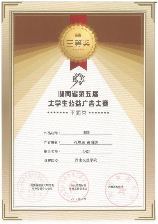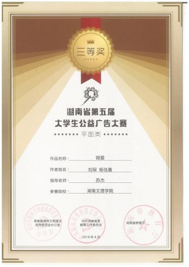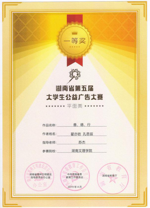 经各学校组织申报,专家评审委员会终评,最终从全省1145件作品中评出湖南省第五届大学生公益广告大赛一等奖19个,二等奖45个,三等奖75个。我校艺术学院视觉传达设计专业16级学生翟亦昉、孔思辰创作的平面海报作品《善、德、行》在本届比赛中获得一等奖,李元、石若曦等8位同学创作的三件平面海报作品获得三等奖,苏杰、熊跃珍老师荣获“优秀指导教师”。