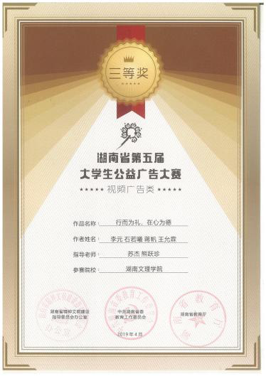 本网讯(艺术学院 供稿) 近日,由省文明办、省委教育工委、 省教育厅联合举办湖南省第五届大学生公益广告大赛顺利收官。