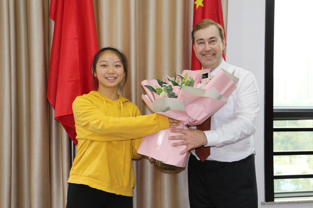 外国语学院英语专业19104班学生钟姝祺代表青年学生向詹姆斯老师献花