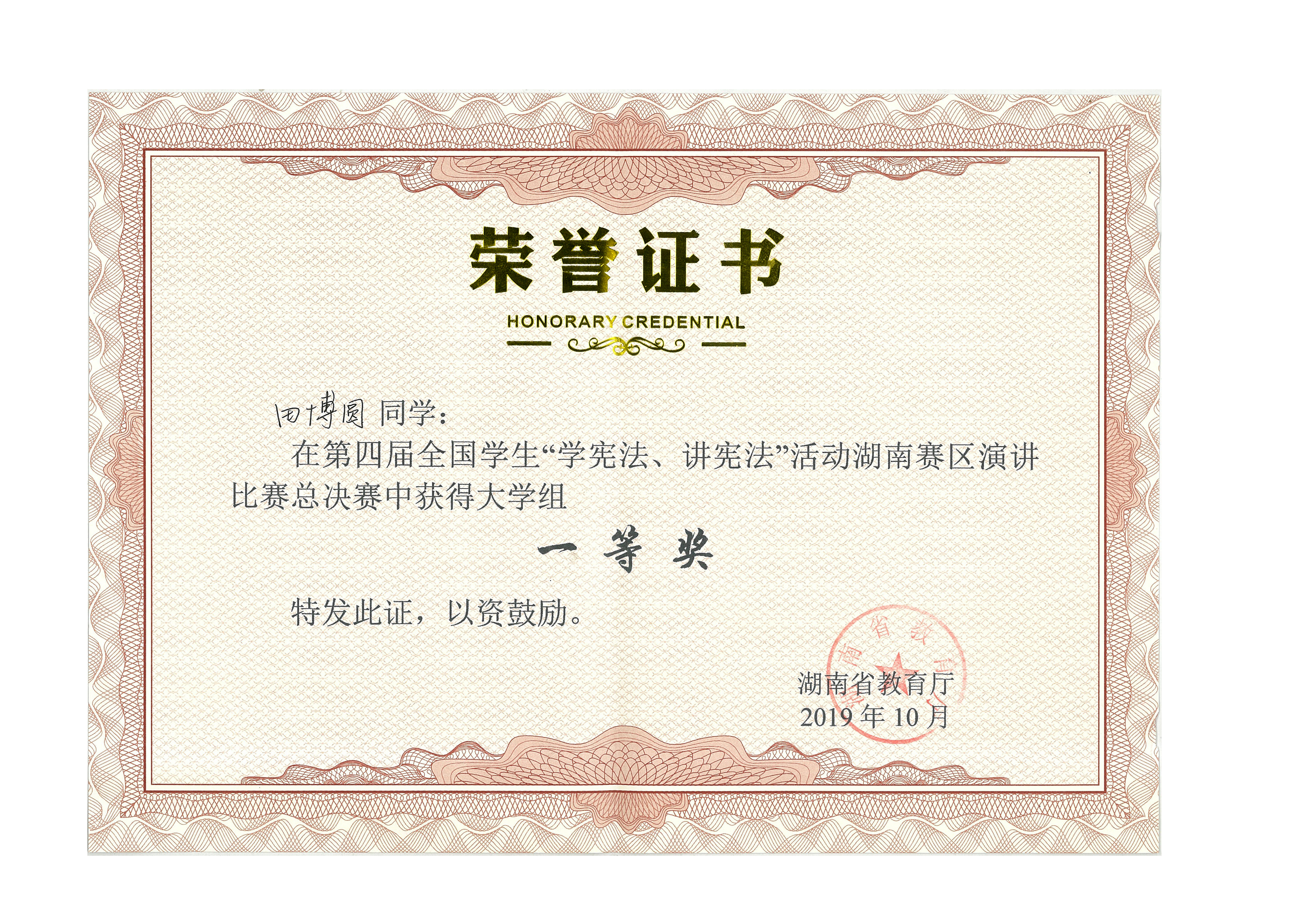 本网讯(团委 供稿)10月12日-13日,由湖南省教育厅主办,湖南省法治教育研究中心和湖南工商大学承办的第四届全国学生“学宪法讲宪法”活动湖南赛区总决赛在湖南工商大学举行。我校文史与法学学院田博圆同学获演讲比赛高校组湖南省一等奖。