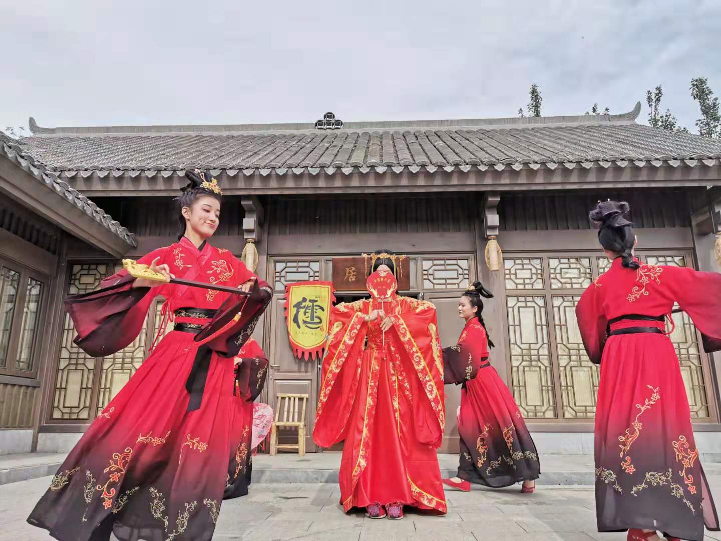 图为我校演员在湖南园门口迎宾